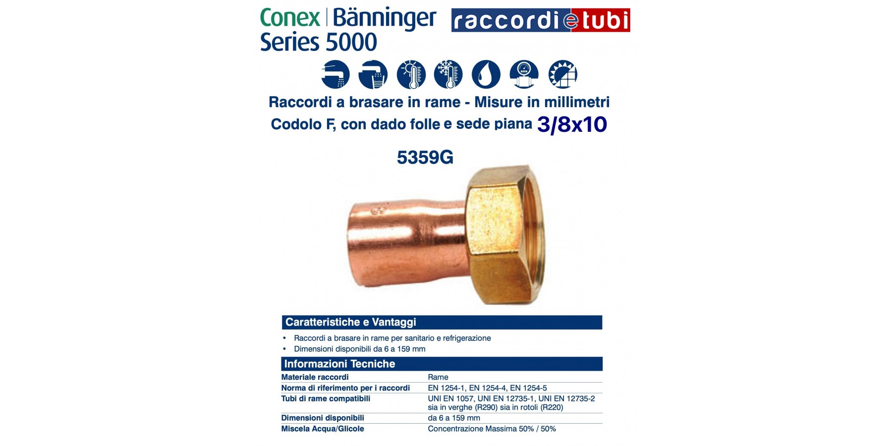 Die Verbindungsstücke der Serie 5000 werden gemäß UNI EN 1254-1, UNI EN 1254-4 und UNI EN 1254-5 hergestellt und sind geeignet für Verbindungen mit Kupferrohren nach UNI EN 1057, UNI EN 12735-1 und UNI EN 12735-2. Sie sind für den Einsatz in Systemen zur Versorgung und Verteilung von Kalt- und Warmwasser, Heiz- und Kühlsystemen, Brenngas- sowie Kältemittelanlagen bestimmt.