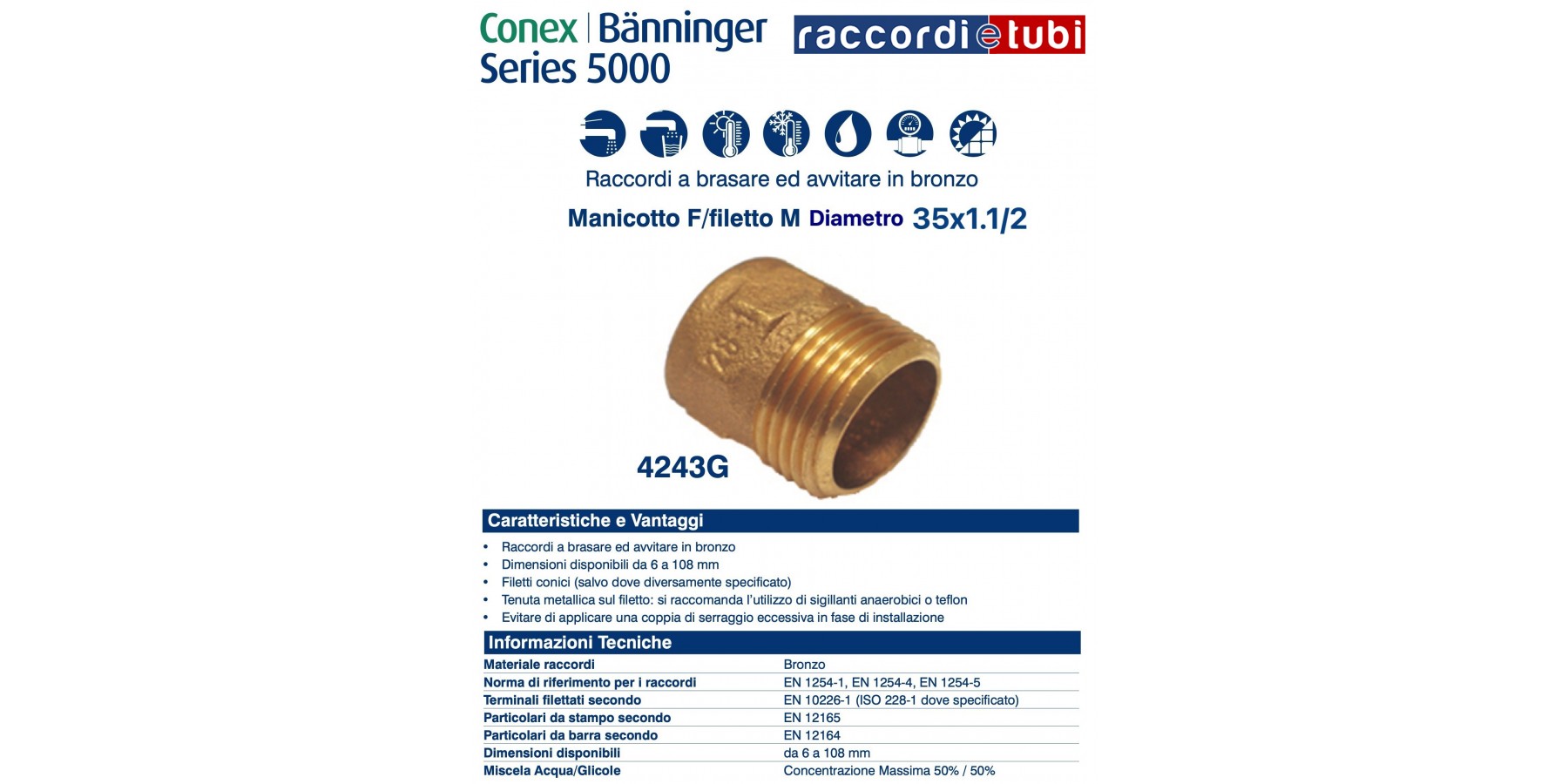 Die Fittings der Serie 5000 werden gemäß UNI EN 1254-1, UNI EN 1254-4 und UNI EN 1254-5 hergestellt und sind geeignet für Verbindungen mit Kupferrohren nach UNI EN 1057, UNI EN 12735-1 und UNI EN 12735-2. Sie sind einsetzbar in Kalt- und Warmwasserinstallationen, Heizungs- und Kühlanlagen, sowie bei brennbaren Gas- und Kältemittelanlagen.