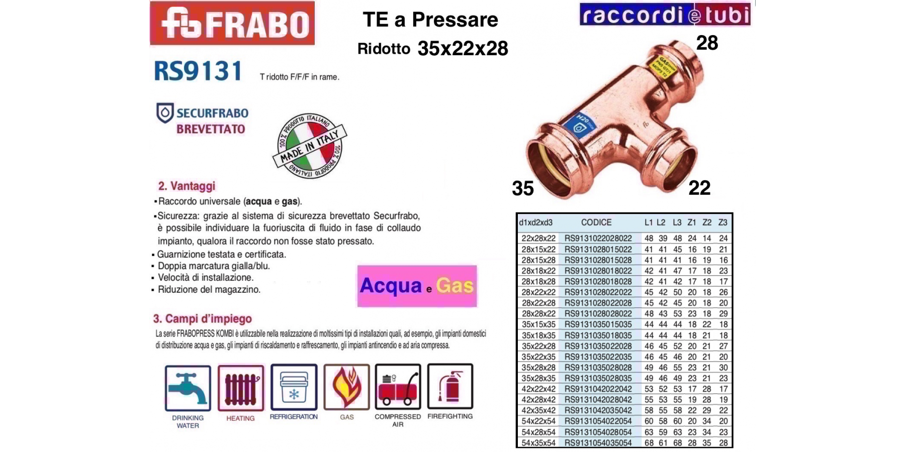 FRABOPRESS KOMBI, mit dem System Securfrabo, ist eine Reihe bestehend aus Pressfittings aus Kupfer und Bronze, verfügbar im Dimensionenbereich von 12 bis 54 mm, anwendbar sowohl für Anlagen, die Gas als auch Wasser fördern.