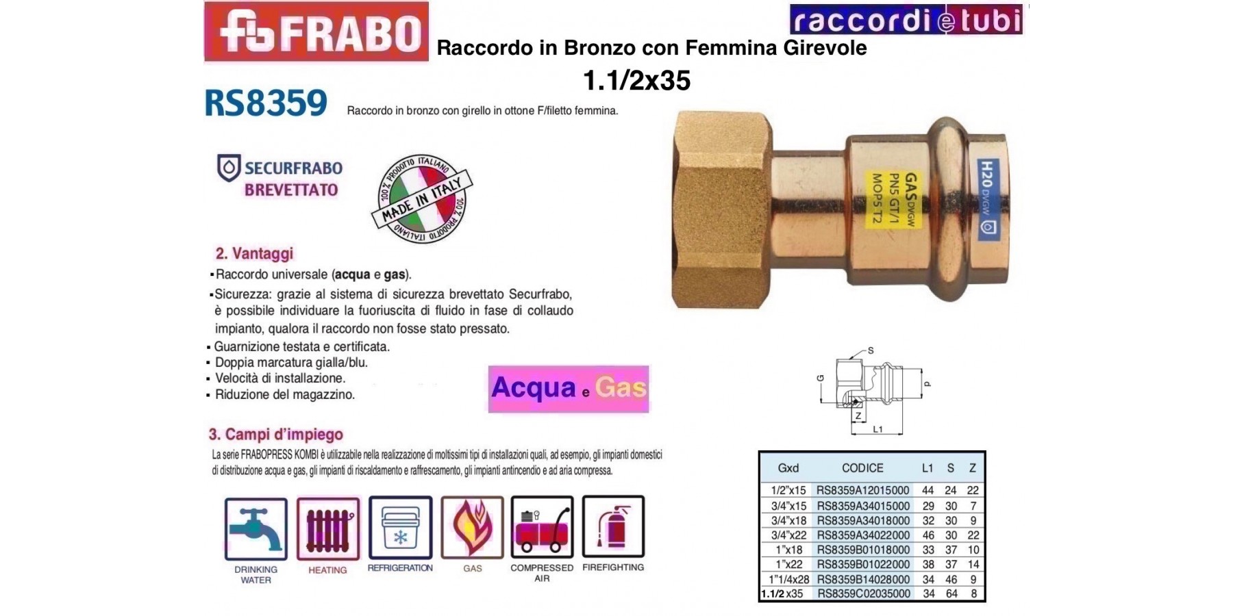 FRABOPRESS KOMBI, mit dem Securfrabo System, ist eine Serie bestehend aus Pressfittings aus Kupfer und Bronze, erhältlich im Größenbereich von 12 bis 54 mm, einsetzbar für Anlagen, die sowohl Gas als auch Wasser transportieren.