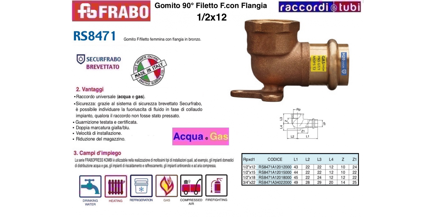 FRABOPRESS KOMBI mit dem Securfrabo-System ist eine Serie von Pressfittings aus Kupfer und Bronze, verfügbar im Größenbereich von 12 bis 54 mm, geeignet für Anlagen zur Beförderung von Gas sowie Wasser.