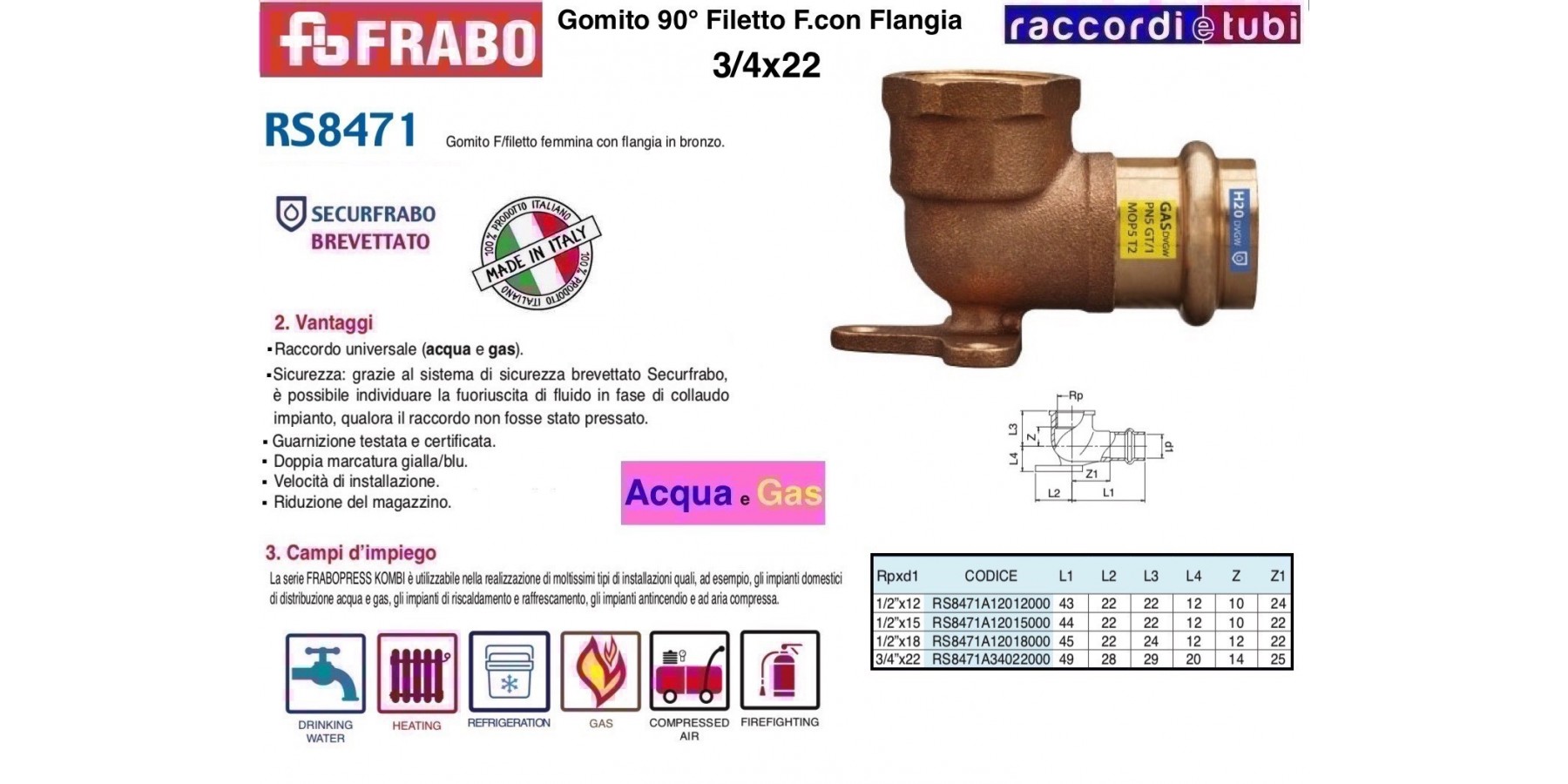 FRABOPRESS KOMBI, mit dem Securfrabo System, ist eine Serie bestehend aus Pressfittings aus Kupfer und Bronze erhältlich im Größenbereich von 12 bis 54 mm, geeignet für Rohrleitungen sowohl für Gas als auch Wasser.