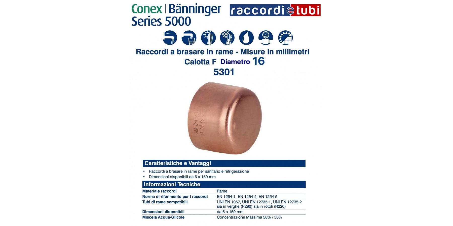 Die Fittings der Serie 5000 werden gemäß UNI EN 1254-1, UNI EN 1254-4 und UNI EN 1254-5 hergestellt und eignen sich für Verbindungen mit Kupferrohren, die nach UNI EN 1057, UNI EN 12735-1 und UNI EN 12735-2 produziert werden. Sie sind geeignet für den Einsatz in Anlagen zur Zuleitung und Verteilung von Kalt- und Warmwasser, Heiz- und Kühlanlagen sowie brennbaren Gasen und Kältemitteln.