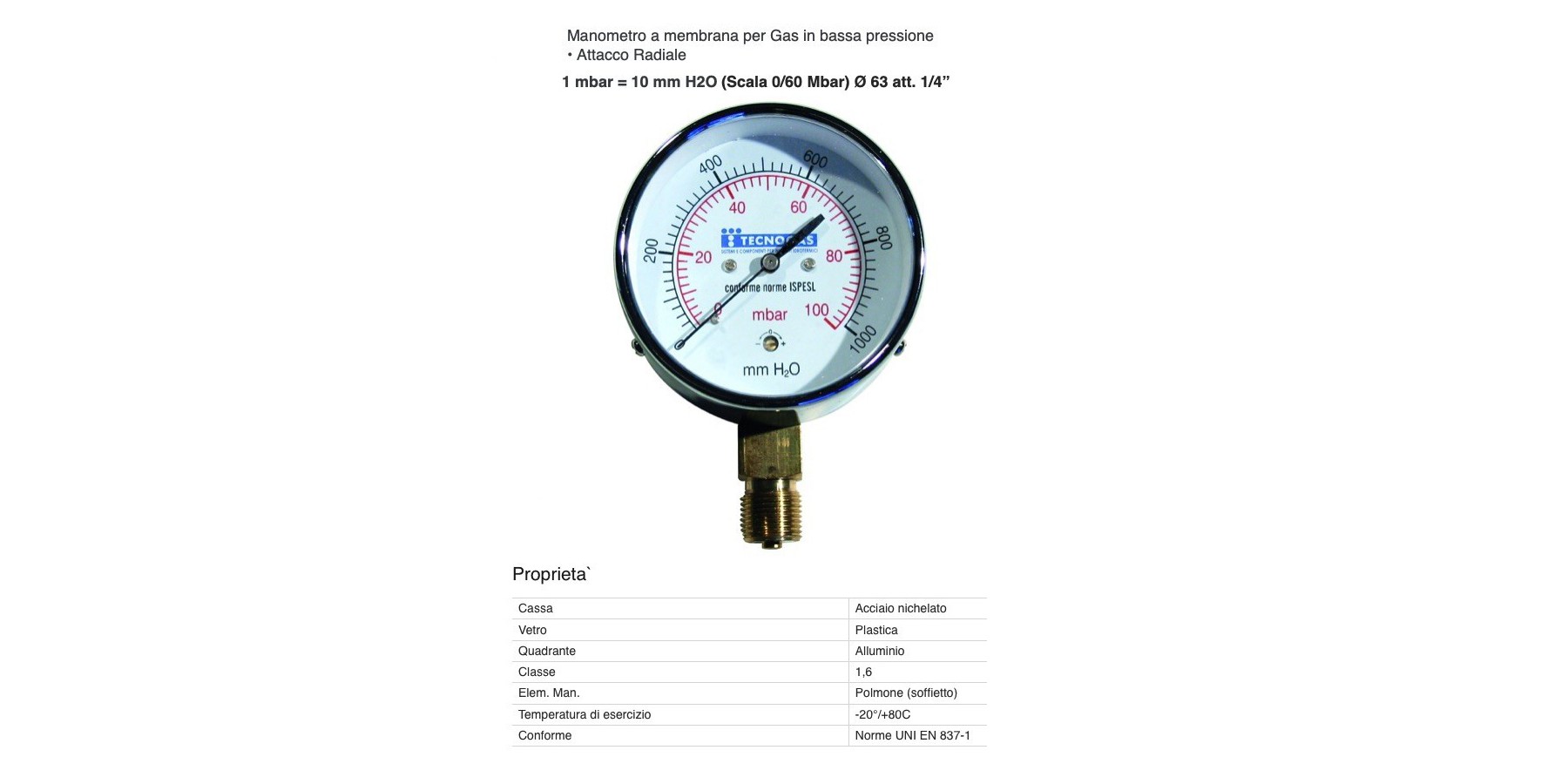 Radialer Gasmanometer für Niederdruck, INAIL-zugelassen, Anschluss 1/4 männlich, Durchmesser 63 mm
