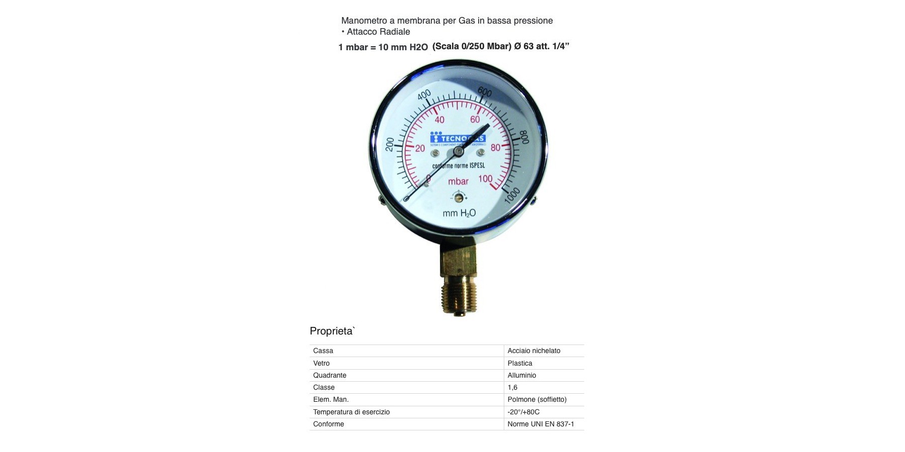 Radialmanometer für Gas mit Niederdruck, INAIL-zugelassen, Anschluss 1/4 Zoll Außengewinde, Durchmesser 63 mm