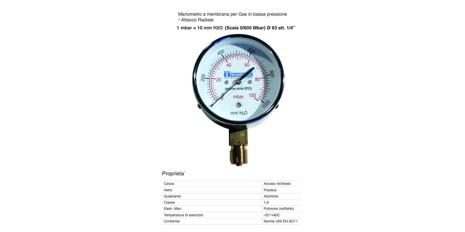 Radialmanometer für Gas mit niedrigem Druck, INAIL-zugelassen, 1/4 Zoll Außengewinde, Durchmesser 63 mm