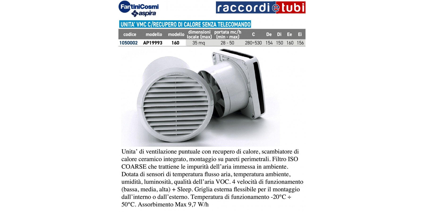 Punktuelle Lüftungseinheit mit Wärmerückgewinnung, integrierter keramischer Wärmetauscher, Montage an Außenwänden. ISO COARSE Filter, der Verunreinigungen der einströmenden Luft im Raum zurückhält. Ausgestattet mit Sensoren für Luftstromtemperatur, Raumtemperatur, Feuchtigkeit, Helligkeit, Luftqualität VOC. 4 Betriebsstufen (niedrig, mittel, hoch) + Sleep. Flexible Außenabdeckung für die Montage innen oder außen. Betriebstemperatur -20°C bis 50°C. Maximaler Verbrauch 9,7 W/h