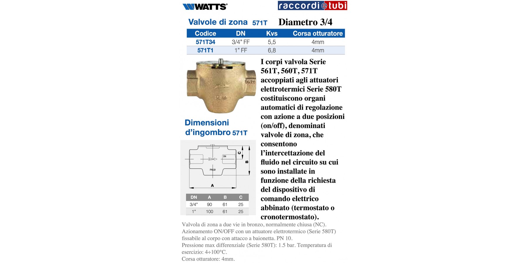 Zonenventil aus Bronze, zweiwege, normalerweise geschlossen (NC). ON/OFF-Betätigung mit einem elektrothermischen Stellantrieb (Serie 580T), der mit Bajonettanschluss am Gehäuse befestigt werden kann.
