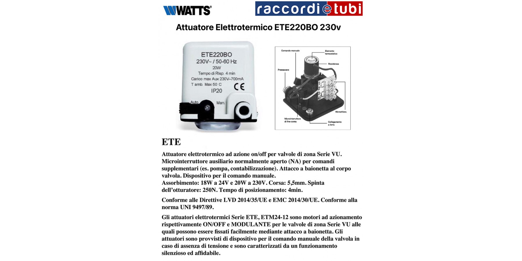 Elektrothermischer Stellantrieb mit Ein-/Aus-Schaltung für Zonenschieber der Serie VU. Hilfsschalter normalerweise offen (NO) für zusätzliche Steuerungen (z.B. Pumpe, Abrechnung). Bajonettanschluss am Ventilkörper. Vorrichtung für manuelle Bedienung.