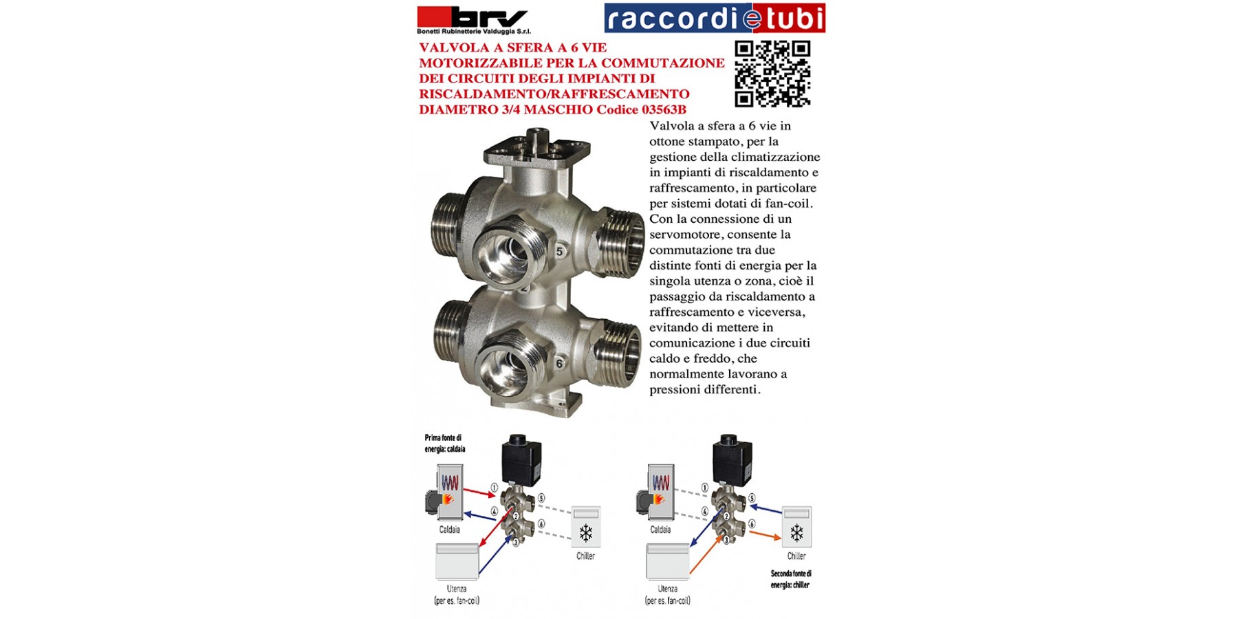 6-Wege-Kugelhahn aus Messingdruckguss zur Steuerung der Klimatisierung in Heiz- und Kühlanlagen, insbesondere für Systeme mit Fan-Coil. Ermöglicht die Umschaltung zwischen zwei verschiedenen Energiequellen für einen einzelnen Verbraucher oder Bereich, also den Wechsel von Heizung auf Kühlung und umgekehrt, ohne die beiden Warm- und Kaltkreisläufe, die unter unterschiedlichen Drücken arbeiten, miteinander zu verbinden.