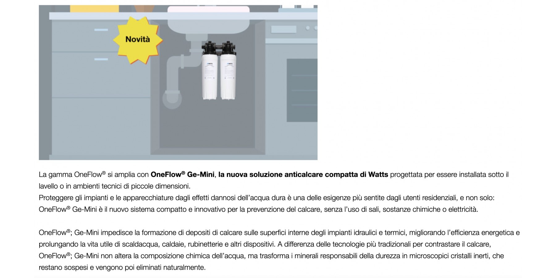 Der Schutz von Anlagen und Geräten vor den schädlichen Auswirkungen von hartem Wasser ist ein häufig geäußertes Bedürfnis von Privathaushalten und darüber hinaus: OneFlow® Ge-Mini ist das neue kompakte und innovative System zur Vorbeugung von Kalk, das ohne den Einsatz von Salzen, Chemikalien oder Strom auskommt.