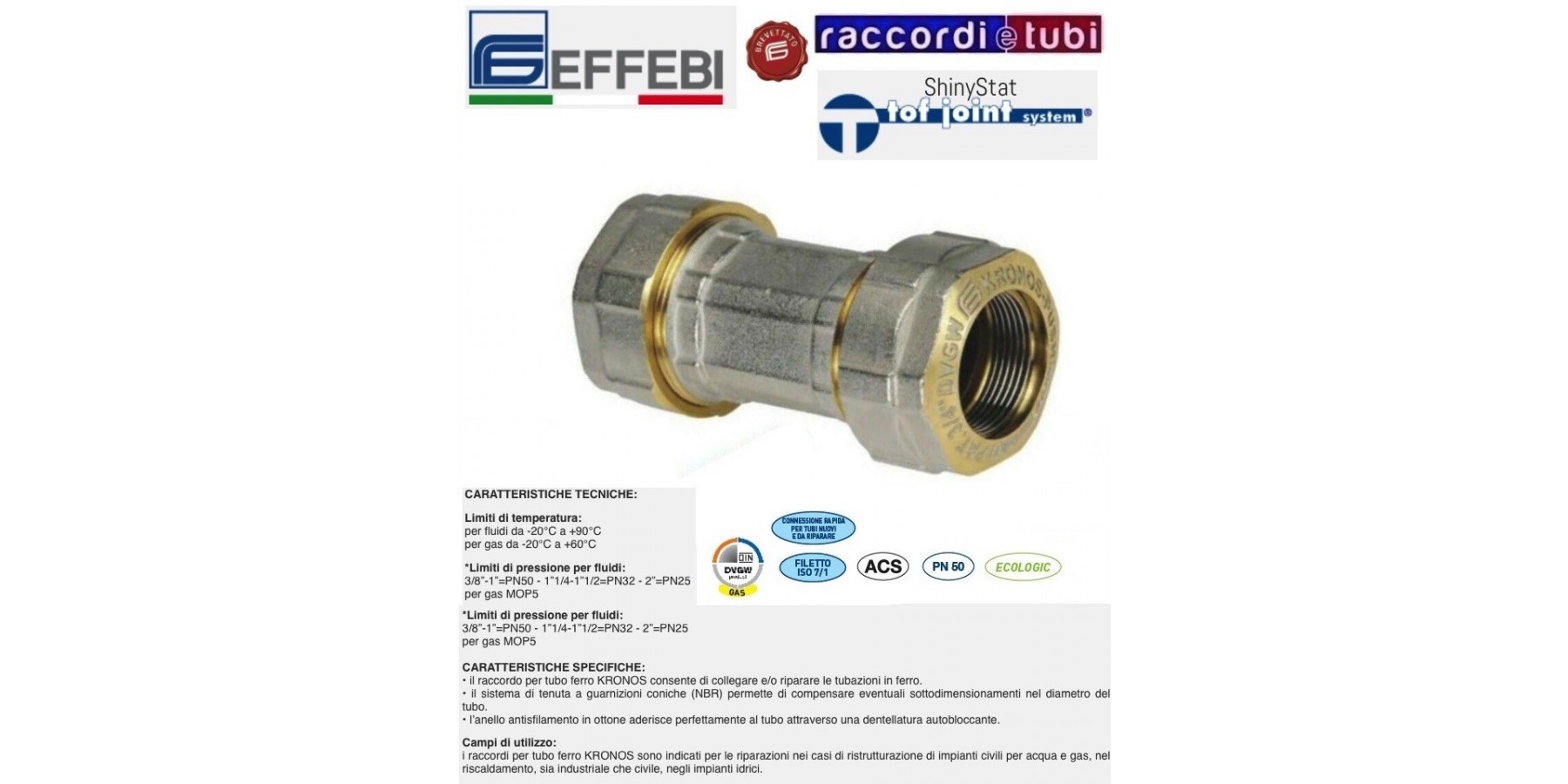 Erhältlich in den Ausführungen Innengewinde, Außengewinde und Rohr-Rohr gleitend, in den Größen von 3/8 bis 2 Zoll, ist die Kupplung von Effebi Spa vollständig in Italien entworfen und hergestellt.