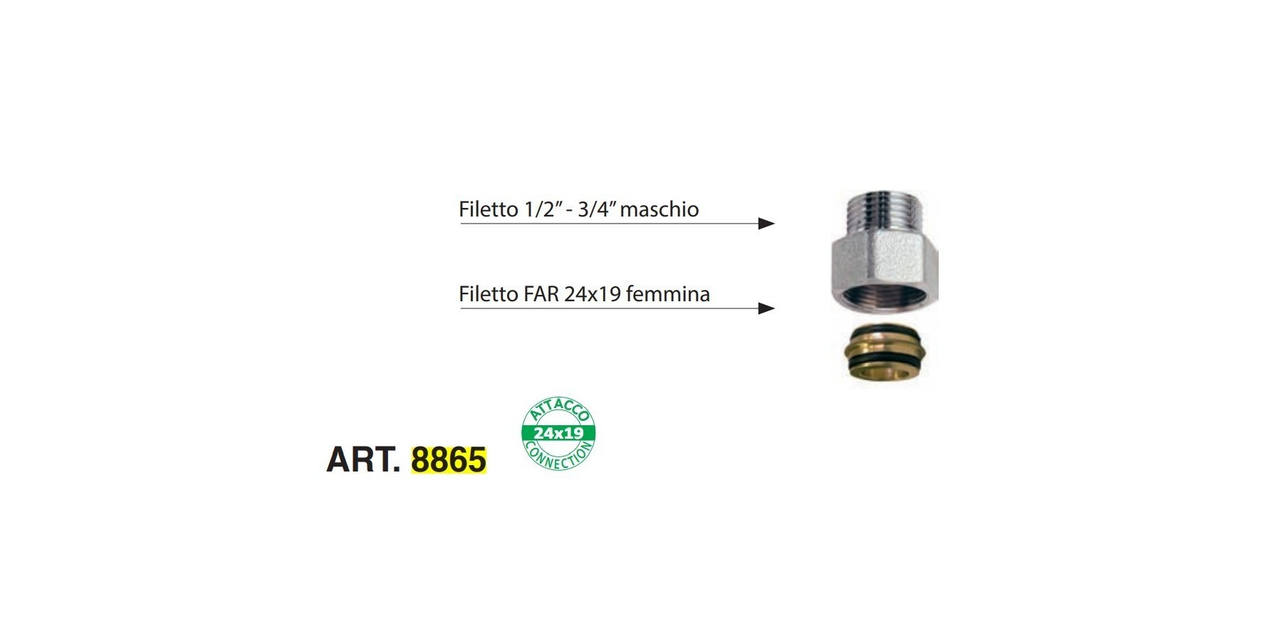 Verchromte Reduzierung, die den Übergang von einem FAR 24x19 männlich auf ein 1/2” - 3/4” männliches Gewinde ermöglicht. • Dichtelement mit doppeltem O-Ring • Nur für FAR 24x19 männliche Anschlüsse mit Ø16mm verwendbar
