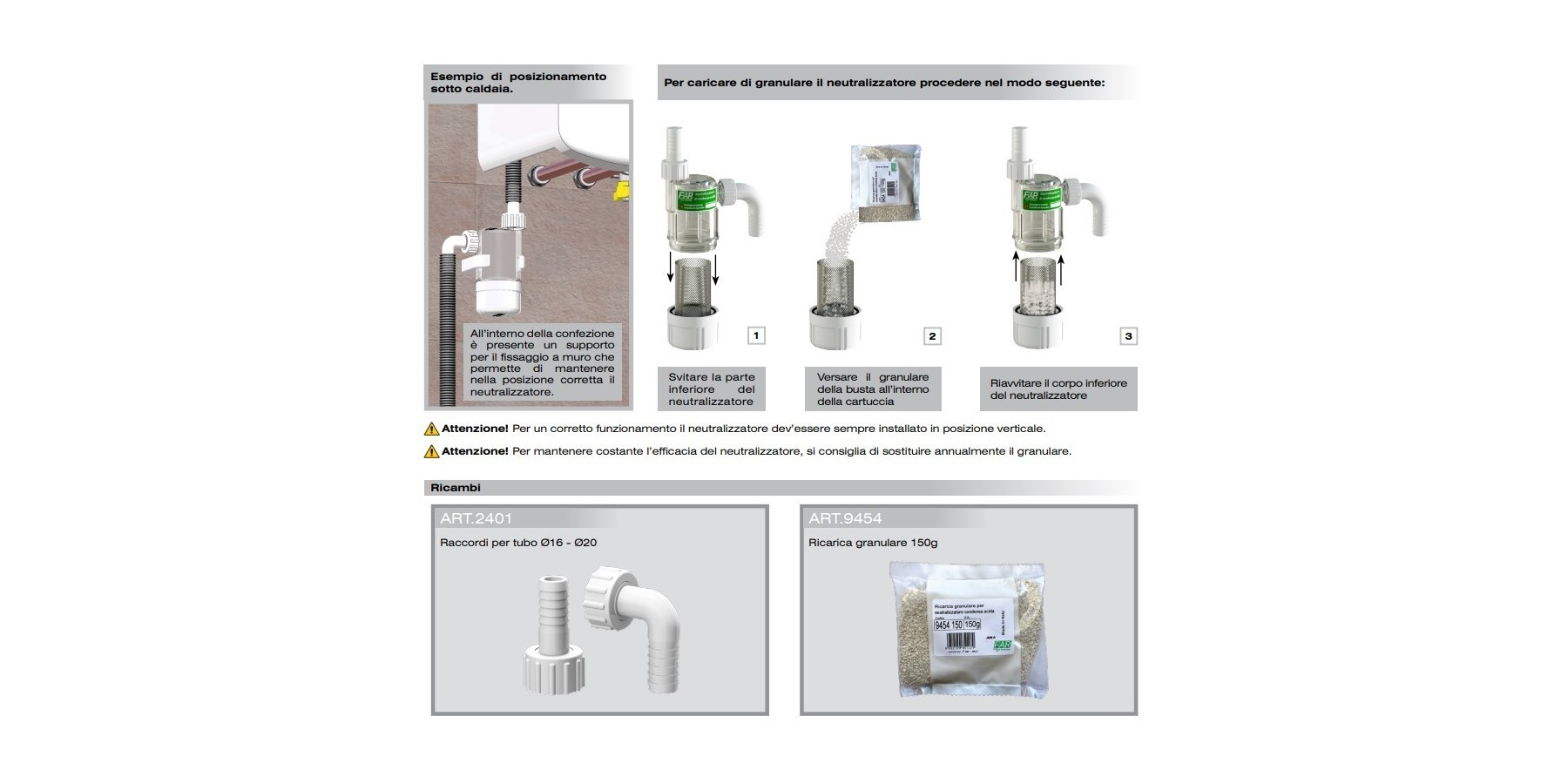 Säurekondensatneutralisator für Heizkessel, komplett mit: - Nr. 1 gebogenem Anschluss mit 3/4” Kappe und Schlauchanschluss - Nr. 1 geradem Anschluss mit 3/4” Kappe und Schlauchanschluss - Nr. 1 Granulatfüllung - Nr. 1 Wandhalterung