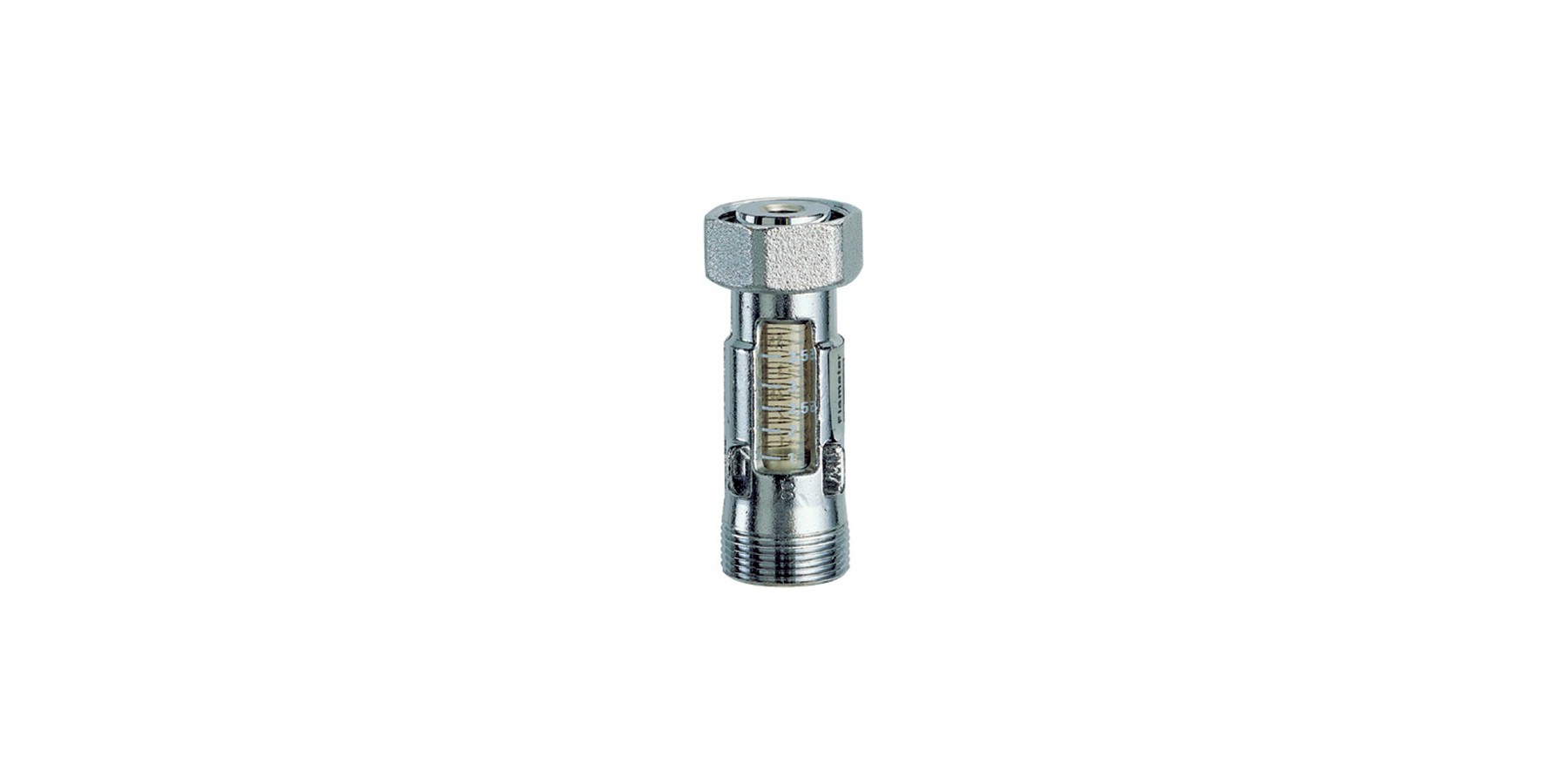Verchromter Durchflussmesser. • Messskala 1 - 3,5 Liter pro Minute • Messskala 2 - 8 Liter pro Minute • Austauschbarer Anschluss für Kupfer-, Kunststoff- und Mehrschlauchrohre • Geeignet zur Installation an Rücklaufverteilern