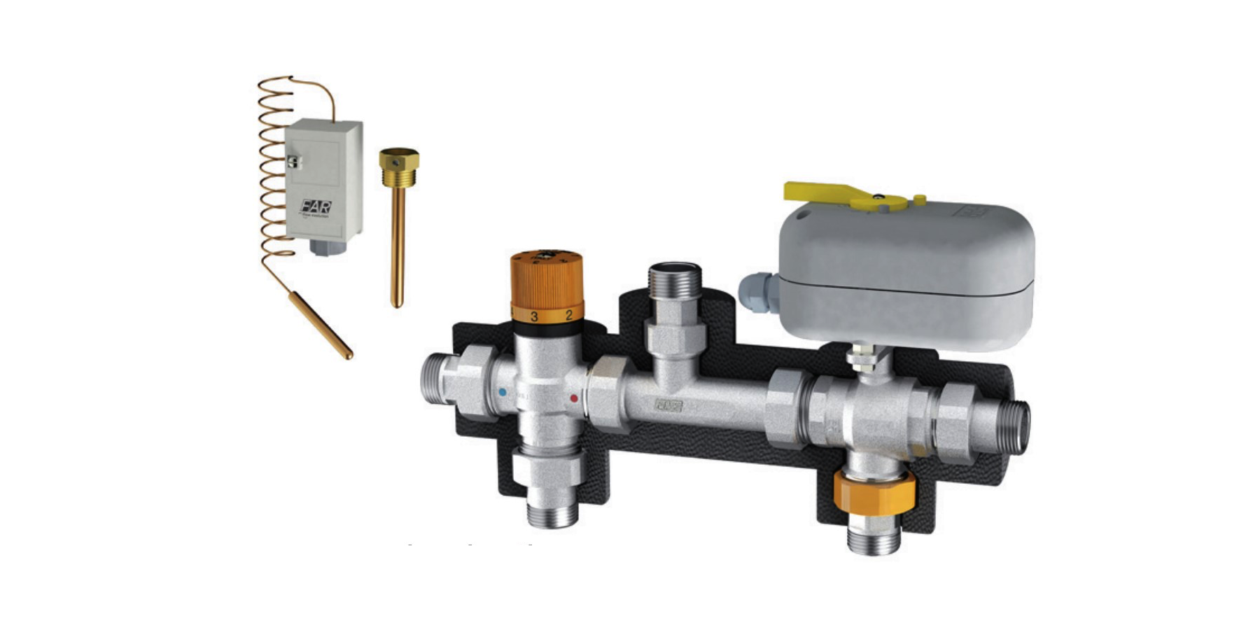 Solargruppe für Anlagen mit Wärmerückgewinnung. • Solar-Mischventil mit Regelbereich 25÷65°C • Umschaltventil 3/4” mit 230V Motor, 8s, mit manueller Entriegelung • Maximale Druck: 10 bar • Maximale Temperatur: 110°C • Rückschlagventile an den Eingängen • Dichtungen aus EPDM • Isolationsmantel • Fernthermostat mit Tauchhülse • Anschlüsse mit 3/4 Zoll Flanschen