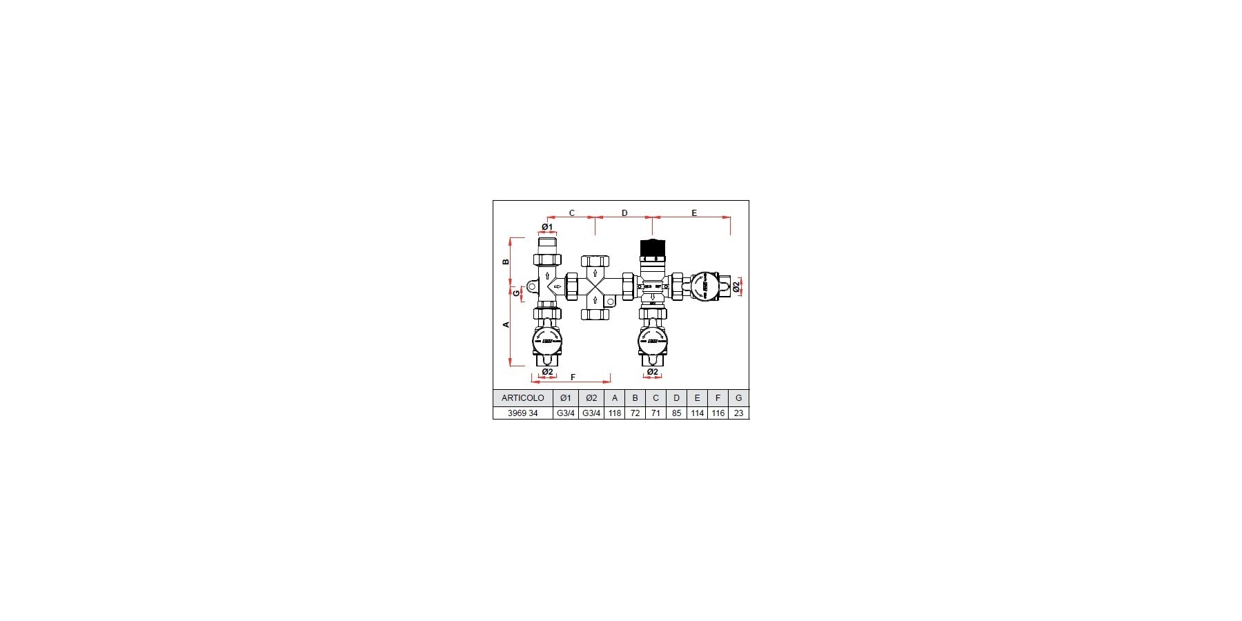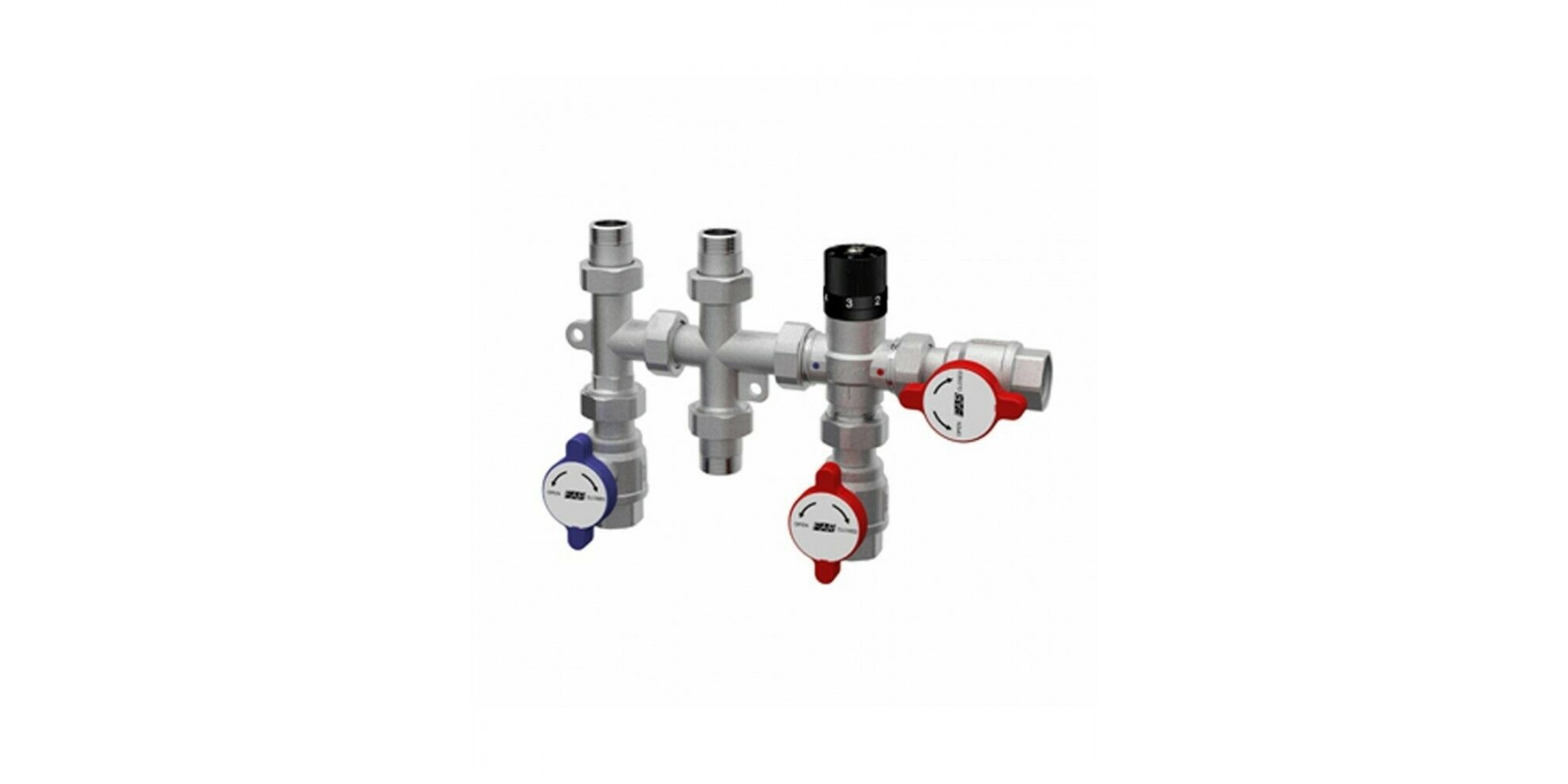 Verbindungsgruppe für Sanitäranlagen, komplett mit: - Umwälzanschlüssen - Thermostatischem Mischer mit einem Einstellbereich von 25÷65° C - Kugelhähnen als Absperrventile - Rückschlagventilen • Nennbetriebdruck: 10 bar • Max. Differenzdruck: 3 bar • Max. Betriebstemperatur: 95°C