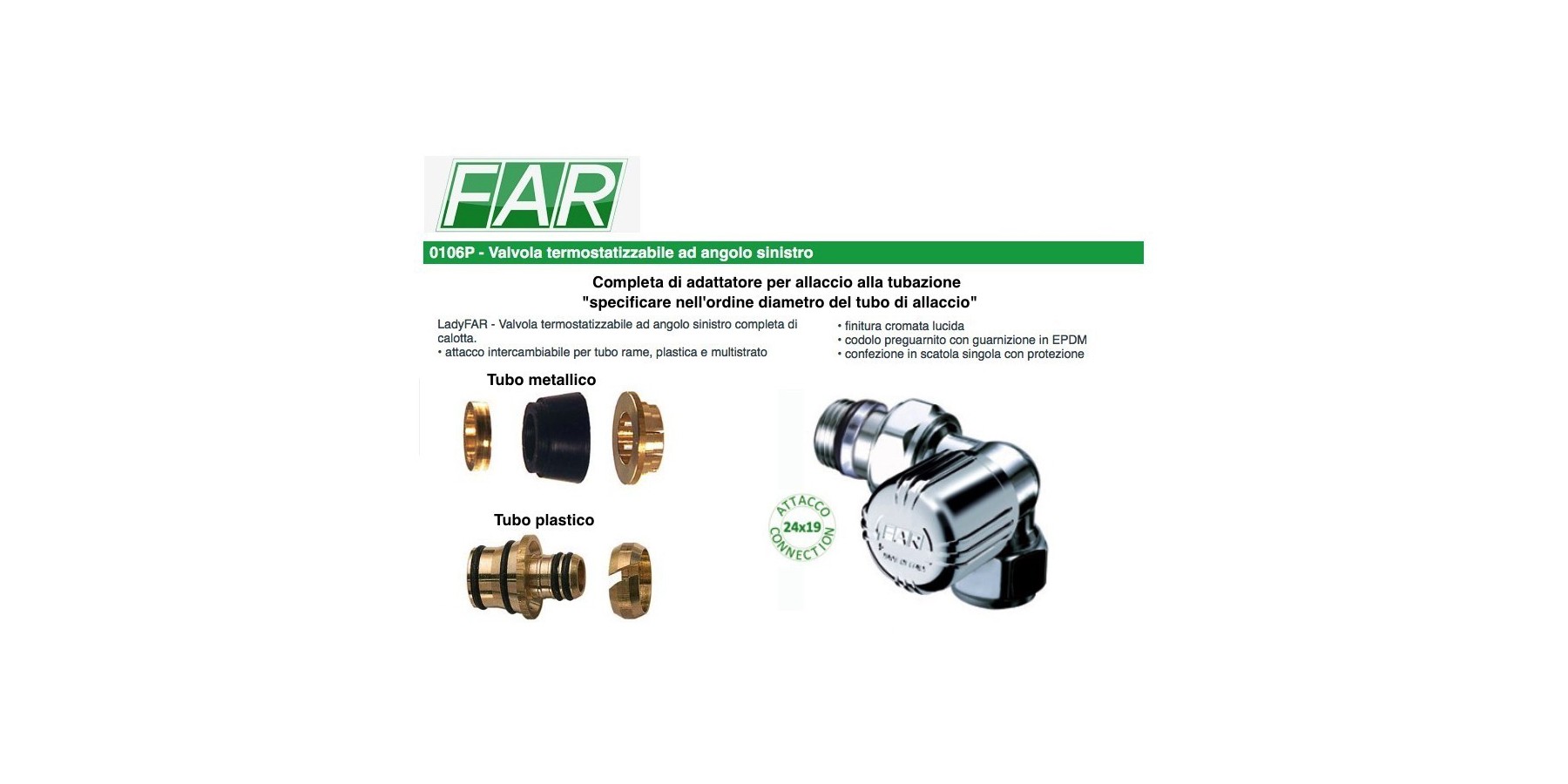 Verchromtes LadyFAR Ventil mit glänzender Chromoberfläche, linkem Winkel, thermostatisch einstellbar für Heizkörper und vorbereitet für die Montage von Thermostat- oder elektrothermischen Antrieben, mit 3/8” und 1/2” Anschlüssen für Kupfer-, Kunststoff- und Mehrschichtrohre, Schaft mit EPDM-Dichtung, Dichtung zwischen Schaft und Ventilgehäuse aus HPF, austauschbare Edelstahl-Spindel mit doppelter O-Ring-Dichtung, Handrad aus ABS und komplette glänzende Chromabdeckung. Maximale Betriebstemperatur 95°C. Maximaler Betriebsdruck 10 bar.