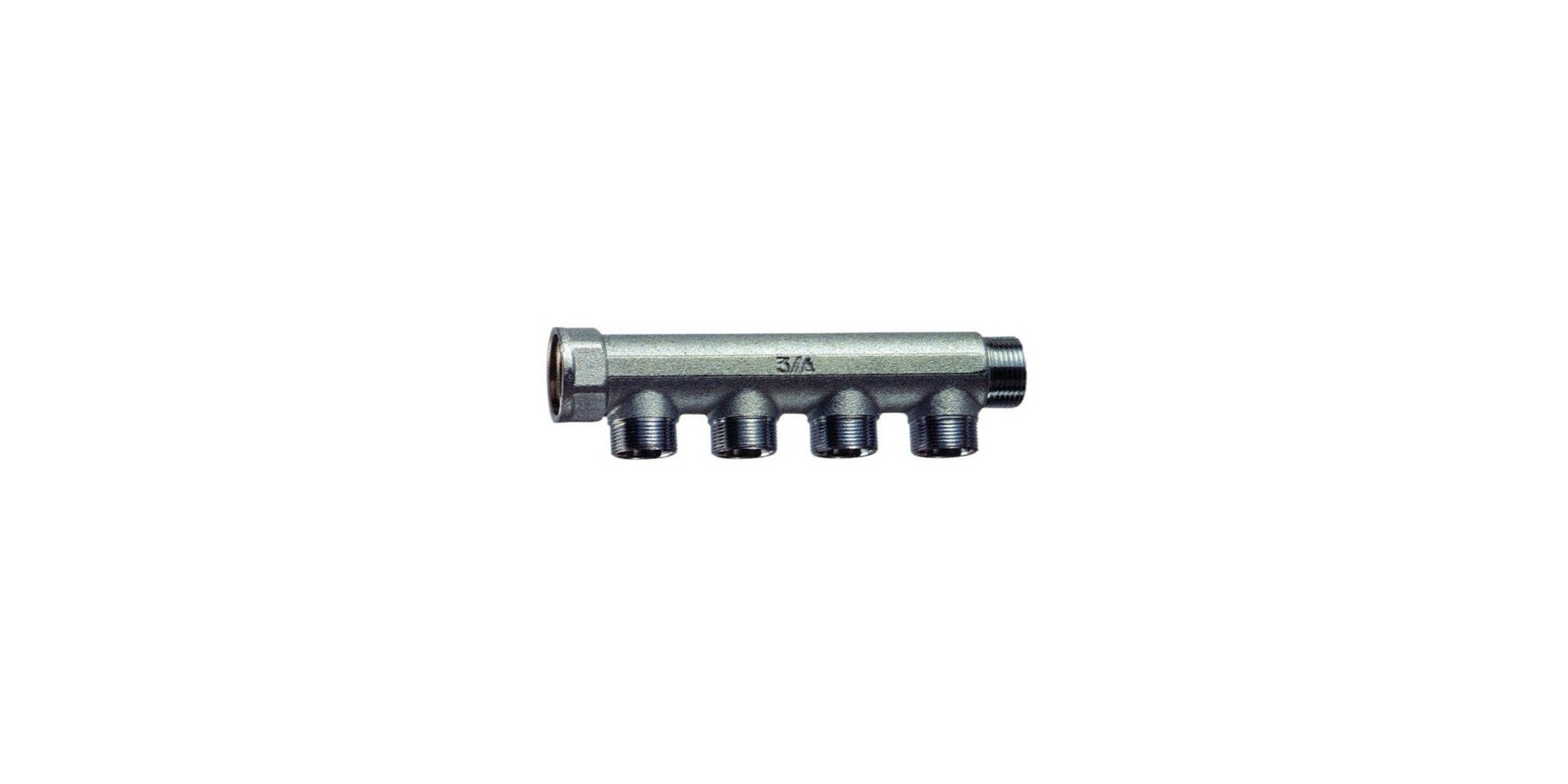 Verchrombares Montagesammelrohr • Gehäuse aus Messing CB753S • Austauschbare Anschlüsse für Kupferrohr, Kunststoff und Verbundrohr • Seitenanschlüsse: 3/4” - 1” männlich-weiblich • Achsabstand der Abzweigungen: 36mm