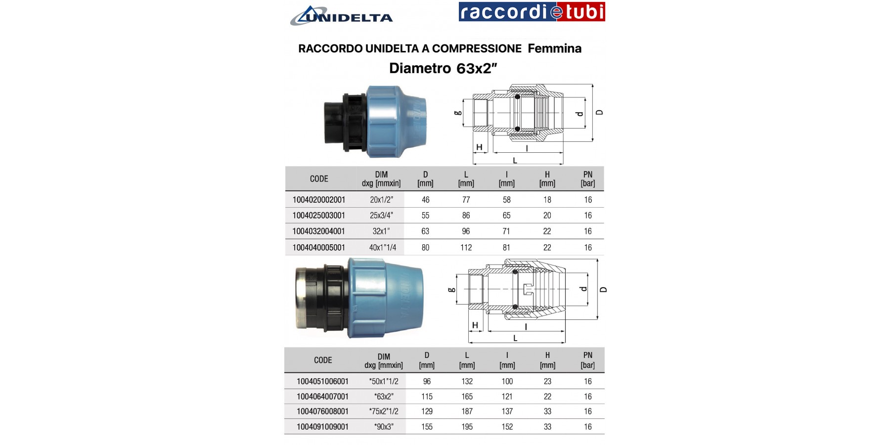 Muffenverbinder 1001 aus Polypropylen PP von Unidelta für den Transport von Trinkwasser und Druckflüssigkeiten bis zu 16 bar. Der Muffenverbinder 1001 aus PP von Unidelta garantiert die perfekte hydraulische Dichtheit bei der Realisierung von Druckverteilungsanlagen. Die Unidelta-Serie ist kompatibel mit allen Rohren aus PE-LD, PE-HD, PE40, PE80, PE100, hergestellt nach den Normen EN 12201, ISO 4427, ISO 14236, ISO 13460, DIN 8074. Der Muffenverbinder 1001 von Unidelta ist ein spezielles Produkt zur Verbindung von Polyethylen-PP-Rohren mit einem Außendurchmesser zwischen 16 und 110 Millimetern.