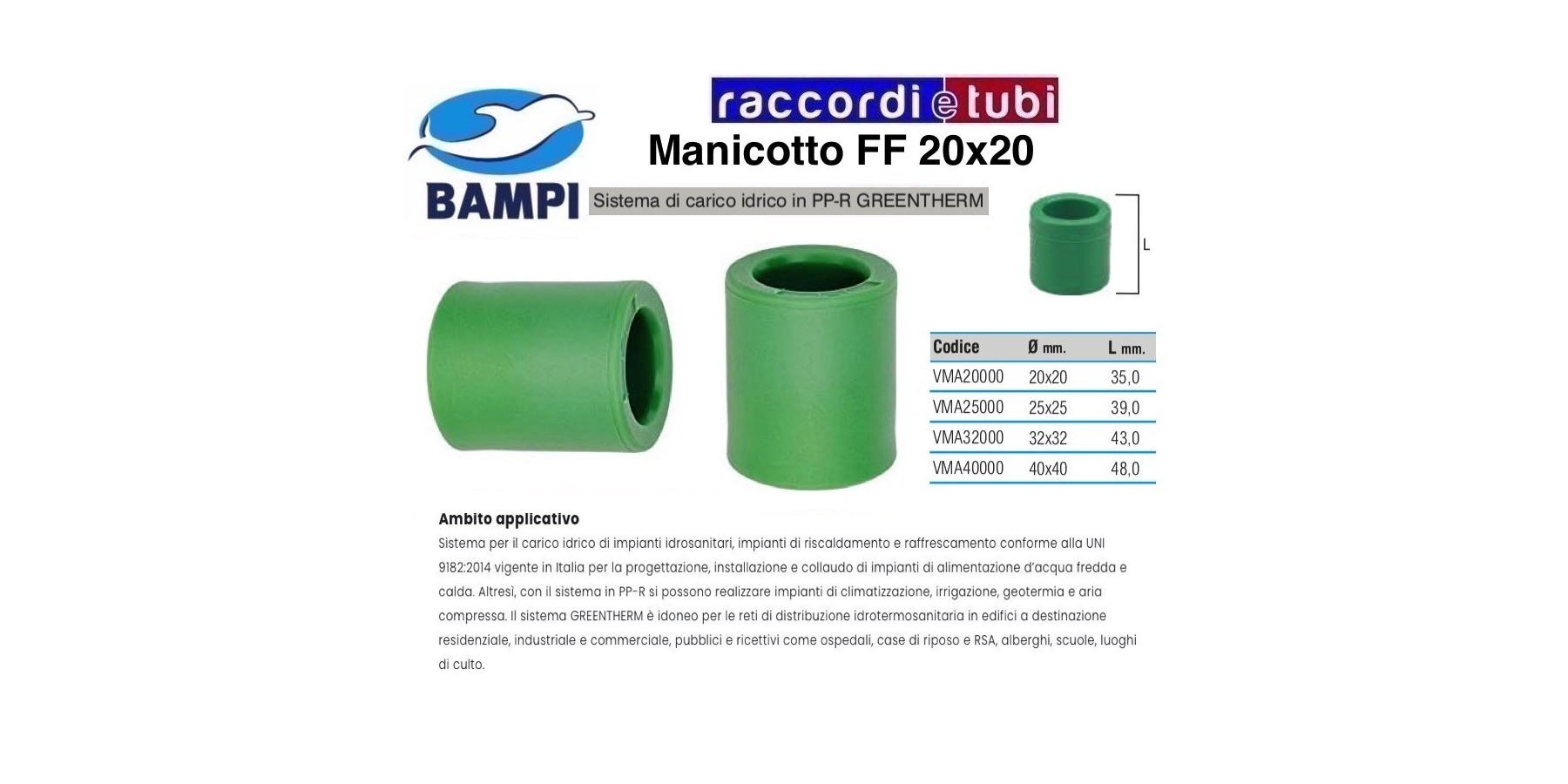 Seit 25 Jahren in der Warm- und Kaltwasserverteilung eingesetzt, bietet das GREENTHERM-System aus Random-Polypropylen absolute Zuverlässigkeit in seinen mechanisch-physikalischen Eigenschaften. Das GREENTHERM-Programm von Bampi umfasst Durchmesser von 20, 25, 32, 40, 50, 63, 75, 90 und 110 mm, mit 4 unterschiedlichen Rohrtypen, die mit einer einzigen Schweißarmaturenserie kompatibel sind: