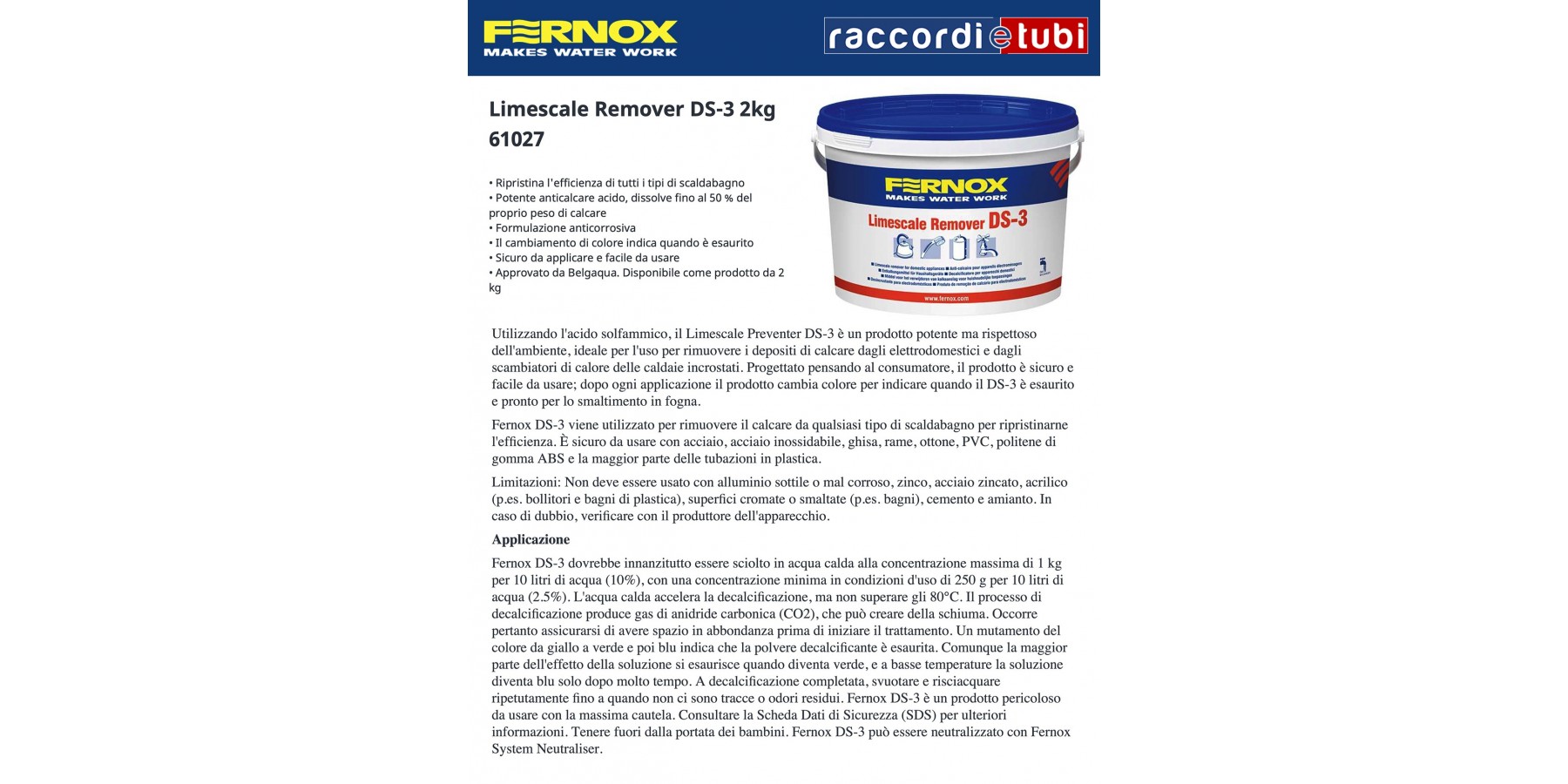 DS-3 ist eine Mischung aus organischen Säuren, angereichert mit Korrosionsinhibitoren und einem Farbwechselindikator; geeignet zum Entfernen von Kalkablagerungen von Wärmetauschern, Kesseln usw. Es ist sicher bei Verwendung mit Stahl, Edelstahl, Gusseisen, Kupfer, Messing und Aluminium. Es kann verwendet werden, um eine komplette Warmwasser-Sanitäranlage zu entkalken. DS-3 kann mit dem System Neutraliser neutralisiert werden.