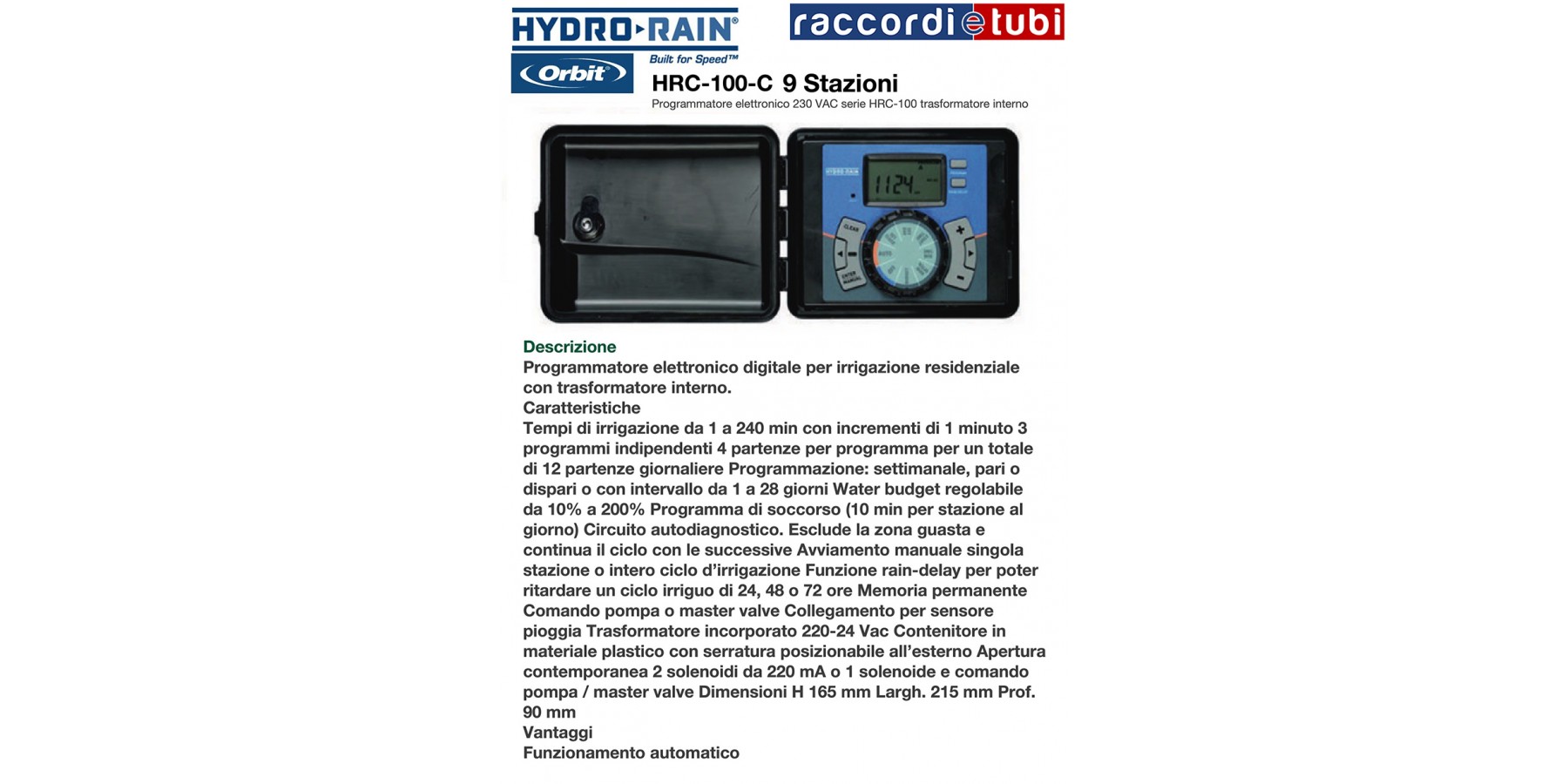 Elektronischer Bewässerungsprogrammierer 230V AC Serie HRC-100 mit internem Transformator für 9 Zonen, Orbit Irrigation Easy Modell 94899 Code INM94899 Steuergerät