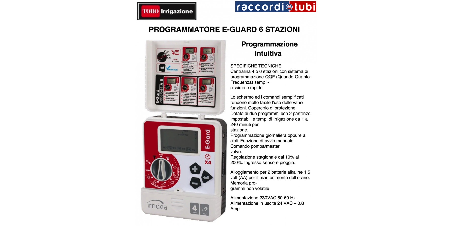 • Elektrische Ausgänge: 24 Volt AC, 0,8 AMP • Masterventil/Pumpenausgang 24 VAC