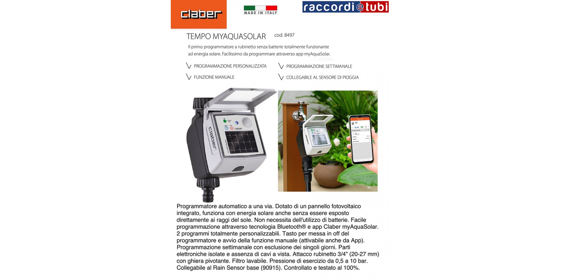 Automatischer Einweg-Programmierer. Ausgestattet mit einem integrierten Photovoltaikmodul, funktioniert er mit Solarenergie, auch wenn er nicht direkt der Sonneneinstrahlung ausgesetzt ist. Batterien werden nicht benötigt. Einfache Programmierung über Bluetooth®-Technologie und die Claber myAquaSolar App. 2 vollständig anpassbare Programme. Taste zum Ausschalten des Programmierers und zum Start der manuellen Funktion (auch über die App aktivierbar). Wöchentliche Programmierung mit Ausschluss einzelner Tage. Elektronische Komponenten isoliert und keine sichtbaren Kabel. Wasseranschluss 3/4" (20-27 mm) mit schwenkbarer Mutter. Waschbarer Filter. Betriebsdruck von 0,5 bis 10 bar. Anschlussfähig an den Rain Sensor Basis (90915). 100% geprüft und getestet.