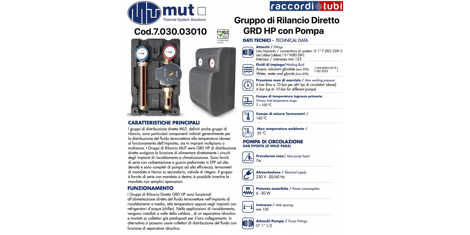 Die Direktverteilungsgruppen MUT, auch Vorlaufverstärker genannt, sind spezielle Bauteile, die allgemein für die Verteilung des Wärmeträgermediums auf eine geeignete Temperatur für den Betrieb der Anlage, sei es in mehrstöckigen oder mehrzonenanlagen, vorgesehen sind. Die Vorlaufverstärker MUT Serie GRD HP für die Direktverteilung dienen dazu, die Kreisläufe von Heizungs- und Klimaanlagen direkt zu versorgen. Sie werden serienmäßig mit hochdichter EPP-Schalenisolierung geliefert und sind komplett mit Hochleistungspumpe, Vor- und Rücklauftemperaturmessern am Sekundärkreis und Rückschlagventilen ausgestattet. Die Gruppe wird standardmäßig mit rechtsseitigem Vorlauf geliefert; die Vorlaufseite kann mit einfachen Handgriffen umgestellt werden.