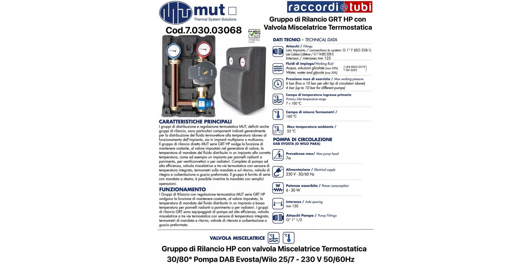 Die direkte Nachspeisegruppe MUT Serie GRT HP hat die Aufgabe, die Temperatur, die im Wärmeerzeuger eingestellt ist, konstant zu halten, wie zum Beispiel bei einer Fußbodenheizung, für Ventilatorkonvektoren oder Heizkörper. Komplett mit hocheffizienter Pumpe, dreigängigem Thermostat-Mischventil mit integriertem Temperatursensor, Thermometern am Vor- und Rücklauf, Rückschlagventil und vorgefertigter Isolierung. Die Gruppe wird serienmäßig mit rechtsseitigem Vorlauf geliefert; der Vorlauf kann mit einfachen Handgriffen gewechselt werden..
