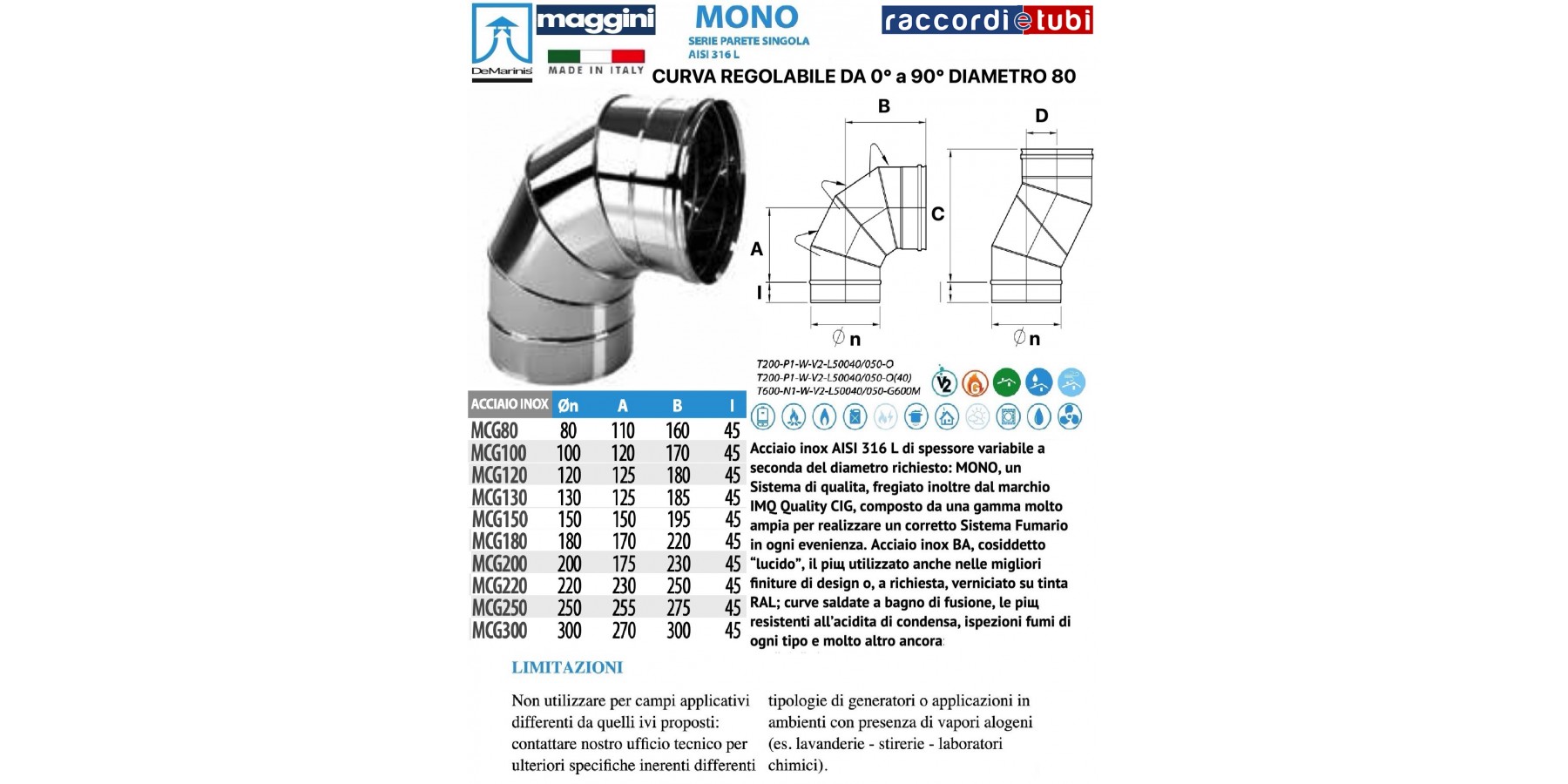Edelstahl AISI 316 L variabler Stärke je nach gewünschtem Durchmesser: MONO, ein Qualitäts-System, zudem ausgezeichnet mit dem IMQ Quality CIG Zeichen, bestehend aus einer sehr umfangreichen Produktpalette zur Realisierung eines korrekten Rauchgassystems in jeder Situation. BA-Edelstahl, sogenannter „glänzender“ Edelstahl, der auch bei besten Designoberflächen am häufigsten verwendet wird oder auf Wunsch in RAL-Farbe lackiert; geschweißte Biegungen im Tauchbad, die beständigsten gegen Kondensäure, Rauchinspektionen aller Art und vieles mehr: Fragen Sie unsere Büros für weitere Informationen.