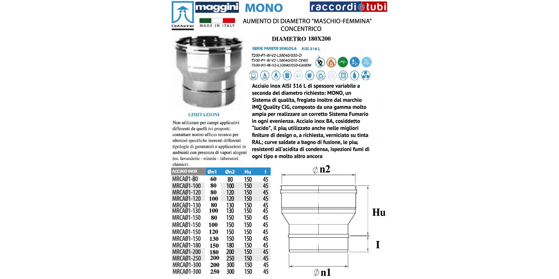 Edelstahl AISI 316 L mit variabler Dicke je nach gewünschtem Durchmesser: MONO, ein Qualitäts-System, zusätzlich ausgezeichnet mit dem IMQ Quality CIG Label, bestehend aus einer sehr umfangreichen Palette zur korrekten Erstellung eines Rauchfangsystems unter allen Bedingungen. Edelstahl BA, sogenannter „glänzender“ Stahl, der auch bei den besten Designoberflächen am häufigsten verwendet wird oder auf Anfrage in RAL-Farben lackiert; mit Schmelzbade geschweißte Bögen, die am beständigsten gegen Säure aus Kondensaten sind, Rauchinspektionen jeder Art und vieles mehr: Bitte fragen Sie unsere Büros nach weiteren Informationen.