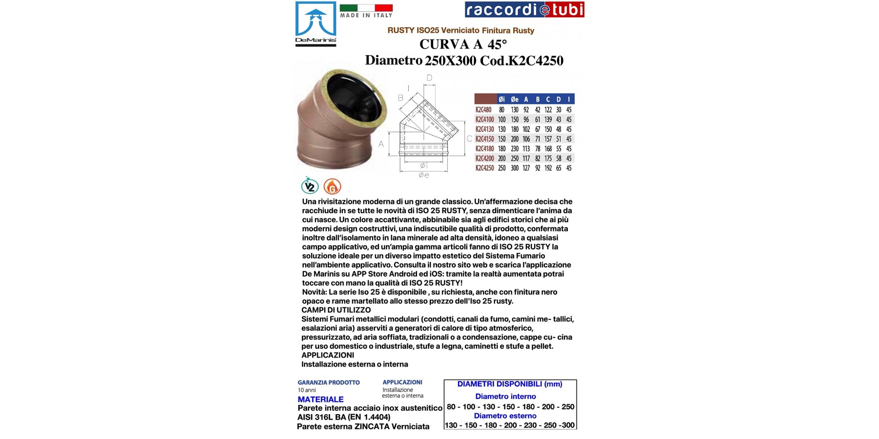 Steife, doppelwandige Steckelemente im ISO 25 RUSTY System mit Qualität und Oberflächenveredelung der Außenwand in „Rusty“-Lackierung für De Marinis S.r.l., gefertigt mit einer Innenwand aus AISI 316 L Edelstahl mit einer Mindeststärke von 0,4 mm und einer Außenwand aus verzinktem Blech mit einer Stärke von 0,5 mm, entsprechend den Anforderungen der europäischen CE-Kennzeichnung gemäß Norm EN 1856-1 2009, mit der Auszeichnung T200-P1-W-V2-L50040-O40 für Anwendungen mit Dichtung oder alternativ für Anwendungen ohne Dichtungsring mit der Auszeichnung T600-N1-W-V2-L50040-G85 nach den gleichen oben genannten Standards. Die Dämmung besteht aus hochdichter Mineralwolle mit einer Dicke von 25 mm, gepresst und zwischen den Wänden ohne Verbindungselemente (Wärmebrücke) eingearbeitet.