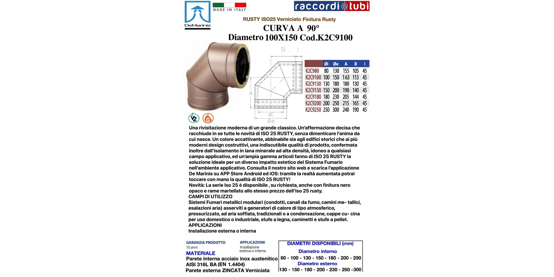 Starre, doppelseitige Systemelemente ISO 25 RUSTY mit Qualität und Oberflächenbeschichtung der Außenwand in Rusty-Lackierung für De Marinis S.r.l., gefertigt mit Innenwand aus Edelstahl AISI 316 L mit einer Mindeststärke von 0,4 mm und Außenwand aus feuerverzinktem Stahlblech mit 0,5 mm Stärke, entsprechend den europäischen CE-Kennzeichnungsstandards gemäß Norm EN 1856-1 2009, mit der Bezeichnung T200-P1-W-V2-L50040-O40 für Dichtungsanwendungen bzw. alternativ für Anwendungen ohne Dichtung mit der Bezeichnung T600-N1-W-V2-L50040-G85 gemäß denselben oben genannten Standards. Die Isolierung besteht aus hochdichter Mineralwolle mit 25 mm Stärke, gepresst und zwischen den Wänden ohne Verbindungsstücke (Wärmebrücke) eingebracht.