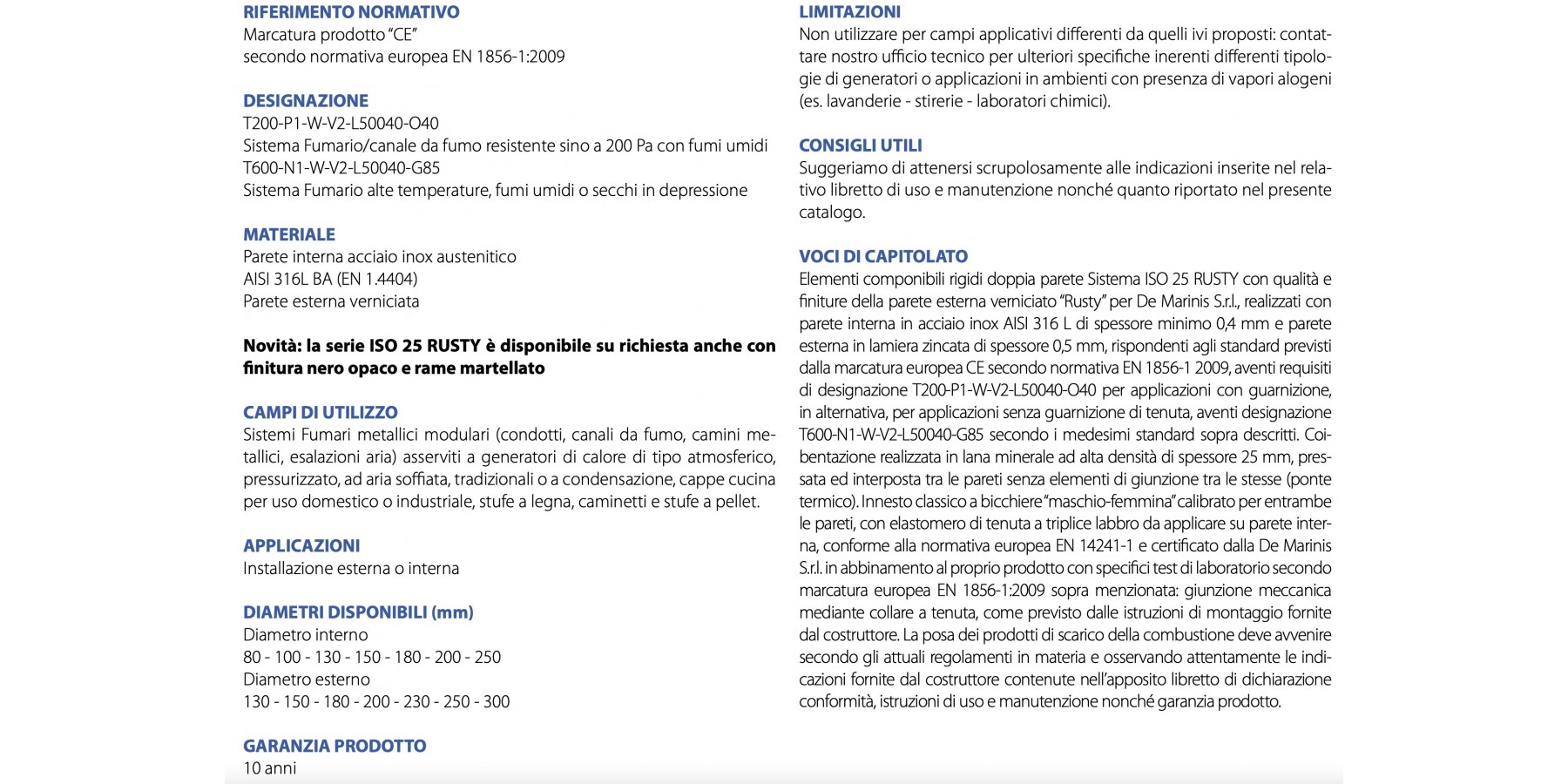 Starre, doppelschichtige modulare Elemente, ISO 25 RUSTY System mit Qualität und Oberfläche der äußeren veredelten "Rusty"-Wand für De Marinis S.r.l., hergestellt mit einer Innenwand aus mindestens 0,4 mm dickem Edelstahl AISI 316 L und einer Außenwand aus 0,5 mm dickem verzinktem Stahlblech, entsprechend den Standards der europäischen CE-Kennzeichnung gemäß der Norm EN 1856-1 2009, mit der Bezeichnung T200-P1-W-V2-L50040-O40 für Anwendungen mit Dichtung oder alternativ für Anwendungen ohne Dichtung mit der Bezeichnung T600-N1-W-V2-L50040-G85 gemäß denselben oben genannten Standards. Die Dämmung besteht aus 25 mm dickem, hochdichtem Mineralwollmaterial, gepresst und zwischen den Wänden ohne Verbindungselemente (Wärmebrücke) eingebracht.