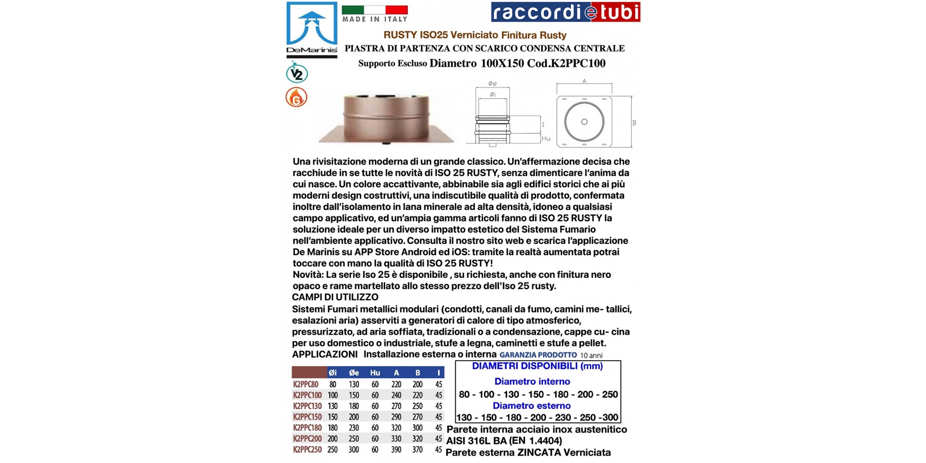 Starre, vielseitig zusammensetzbare Doppelwand-Elemente System ISO 25 RUSTY mit Qualität und Verarbeitung der Außenwand, lackiert „Rusty“ für De Marinis S.r.l., gefertigt mit Innenwand aus Edelstahl AISI 316 L mit einer Mindeststärke von 0,4 mm und Außenwand aus verzinktem Blech mit einer Stärke von 0,5 mm, die den europäischen CE-Kennzeichnungsstandards gemäß Norm EN 1856-1 2009 entsprechen. Sie erfüllen die Designationsanforderungen T200-P1-W-V2-L50040-O40 für Anwendungen mit Dichtung oder alternativ für Anwendungen ohne Dichtungsanschluss mit der Bezeichnung T600-N1-W-V2-L50040-G85 nach denselben oben genannten Standards. Die Isolierung besteht aus 25 mm starkem, hochdichtem Mineralwollvlies, das zwischen den Wänden gepresst ist, ohne Verbindungselemente (Wärmebrücke).