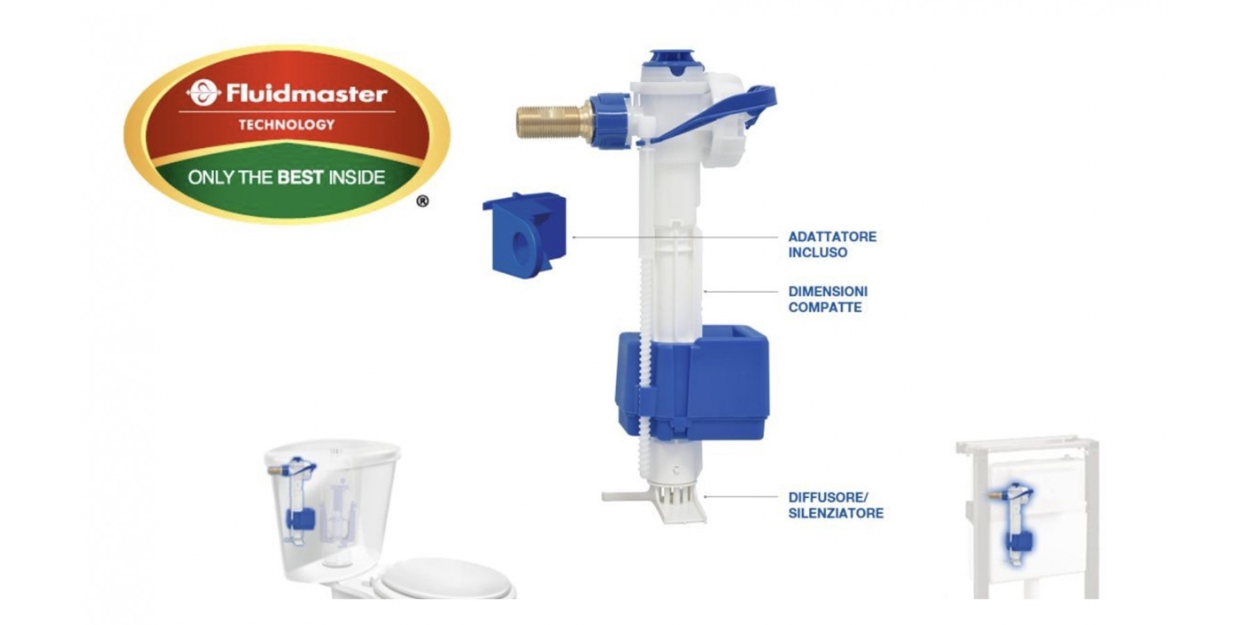 Fluidmaster seitlicher 3/8-Schwimmer Leiser Betrieb; Instantaner Verschluss des Wasserflusses auf dem gewünschten Niveau unter Nutzung des einströmenden Wasserdrucks; Einfache, präzise und druckunabhängige Einstellung des Pegels im Spülkasten; Korrosionsbeständige Materialien; Kompakte Form und geringe Abmessungen; Einfache und schnelle Installation; Meldet mögliche Leckagen des Spülkastens; Teleskopische Höhenverstellung.