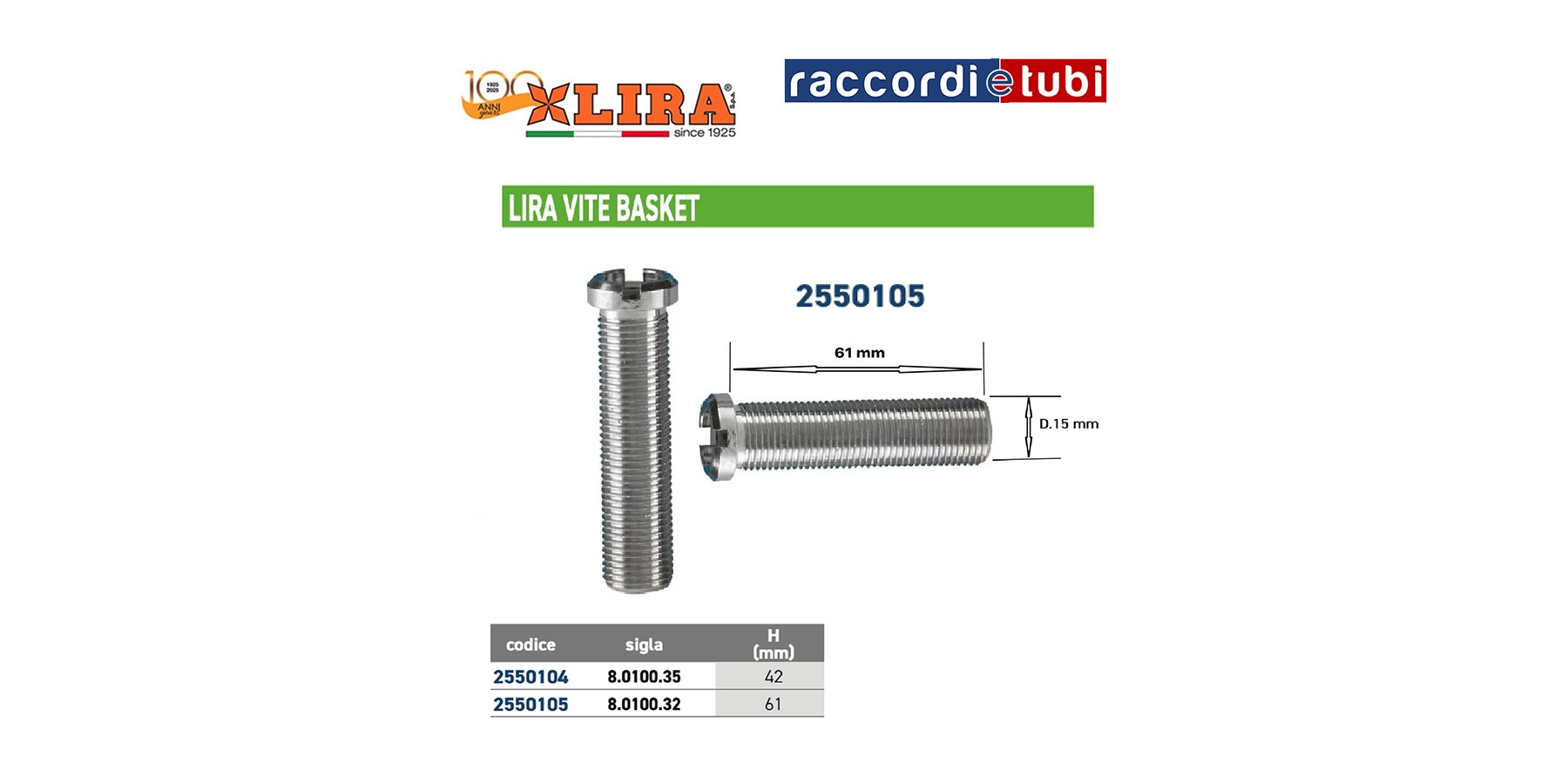 VERLÄNGERUNGSSCHRAUBE FÜR LIRA-ABLAUFGITTER MÜNZSCHNITT HÖHE mm.61 GEWINDEDURCHMESSER mm.15