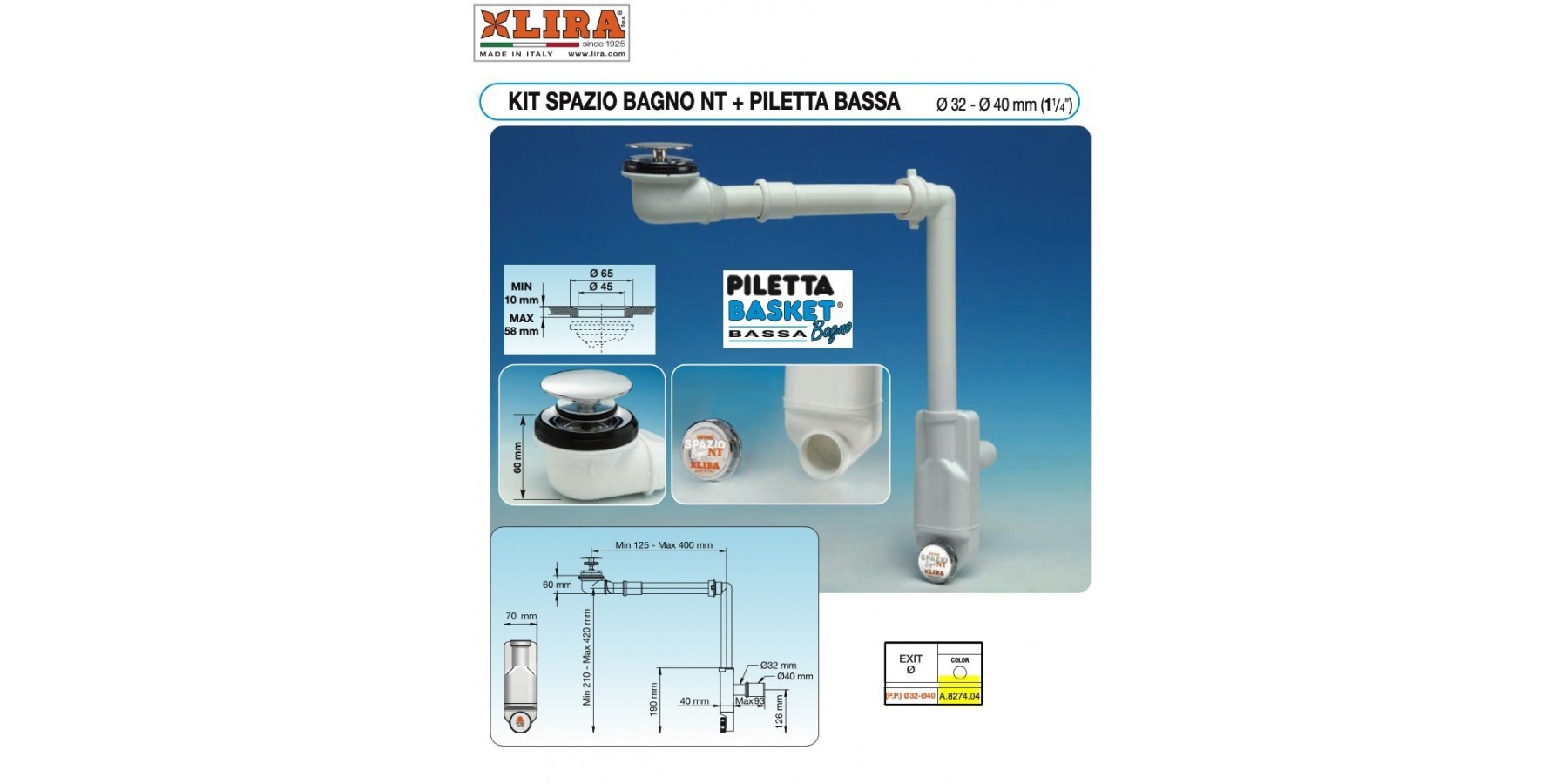 SIFON LIRA SPAZIO BAD NT PILETTE NIEDRIG 32X1.1/4 ABFLUSS 40 A.8274.04