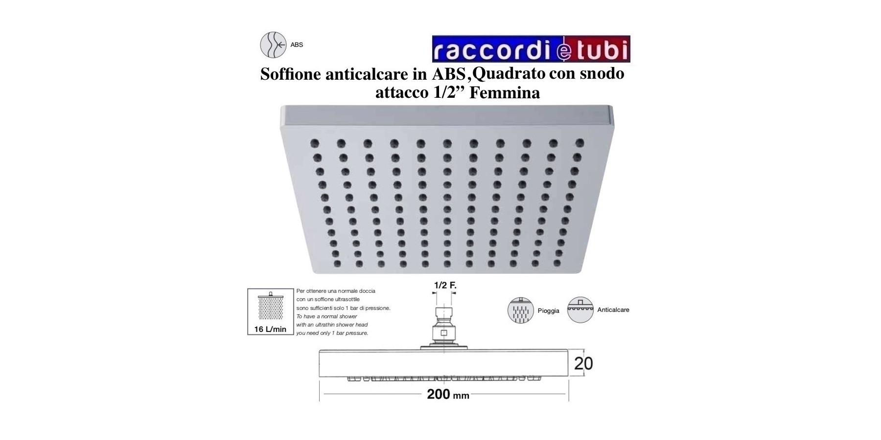 QUADRATISCHER ANTIKALK-DUSCHKOPF AUS ABS 200X200 mm