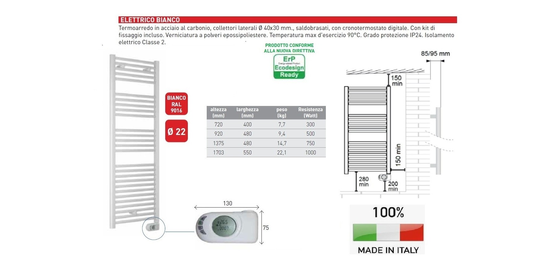 Elektro-Heizkörper aus Kohlenstoffstahl, Seitenkollektoren Ø 40x30 mm, gelötet, mit digitalem Chronothermostat. Befestigungskit