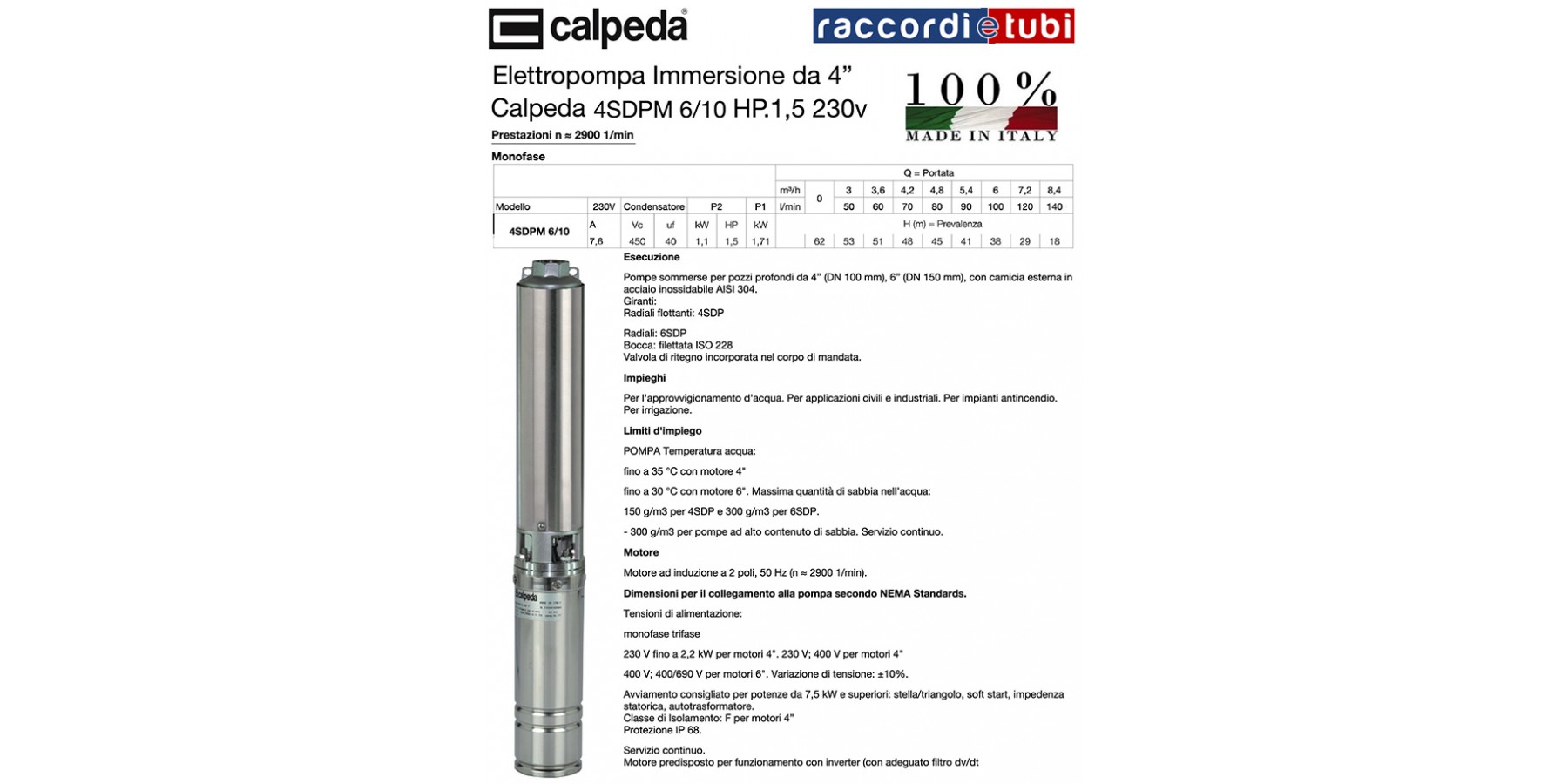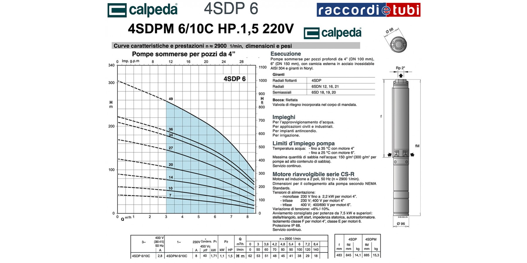 Tauchpumpen für Tiefbrunnen mit 4" (DN 100 mm), 6" (DN 150 mm), mit Außenmantel aus Edelstahl AISI 304 und Laufrädern aus Noryl.