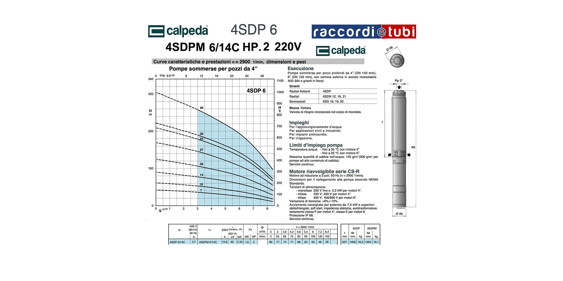 Tauchpumpen für Tiefbrunnen mit 4” (DN 100 mm), 6” (DN 150 mm), mit Außenmantel aus Edelstahl AISI 304 und Laufrädern aus Noryl.