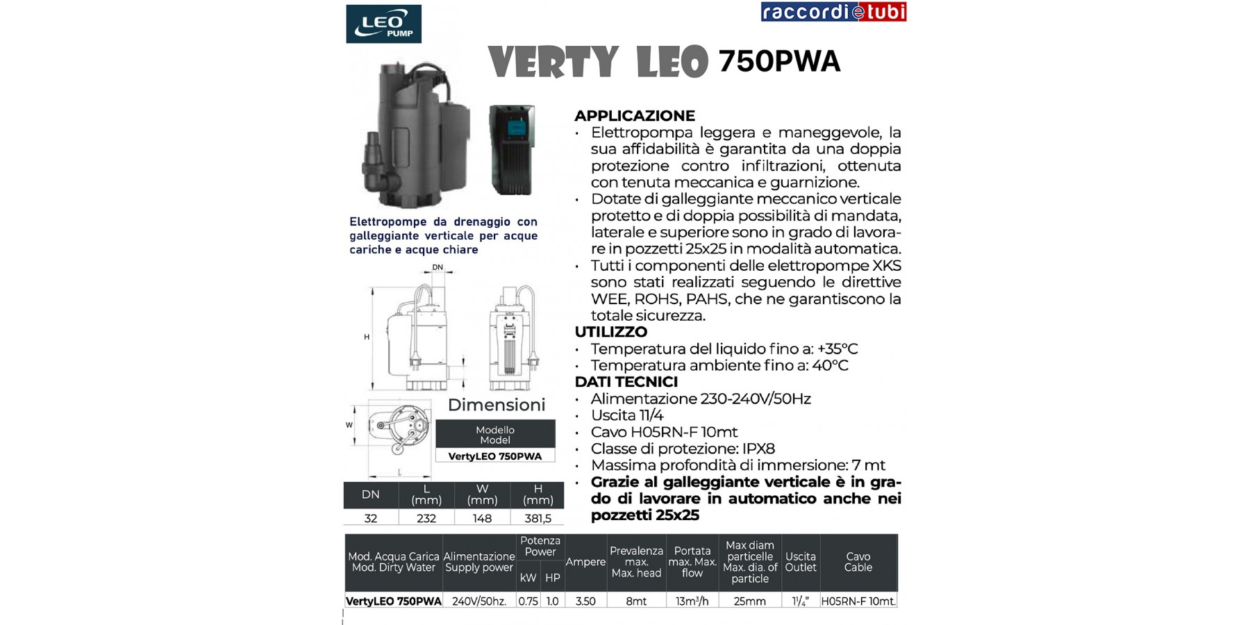 Ausgestattet mit geschütztem vertikalem Schwimmer und doppelter Auslassmöglichkeit, seitlich und oben, kann sie in Schächten 25x25 im Automatikbetrieb arbeiten.