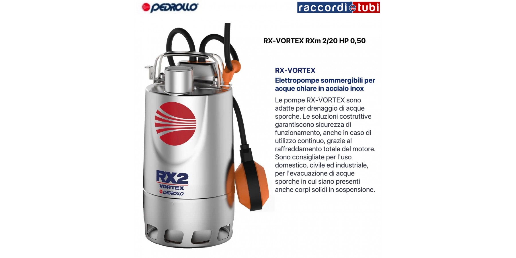 LEISTUNGSBEREICH • Fördermenge bis zu 380 l/min (22,8 m3/h) • Förderhöhe bis zu 12,8 m EINSATZ UND INSTALLATION Die RX-VORTEX-Pumpen eignen sich für das Abpumpen von schmutzigem Wasser. Die konstruktiven Lösungen gewährleisten einen sicheren Betrieb, auch bei Dauerbetrieb, dank der vollständigen Kühlung des Motors. Sie sind für den häuslichen, zivilen und industriellen Gebrauch empfohlen, zur Ableitung von schmutzigem Wasser, in dem auch Feststoffe in Suspension vorhanden sind. EINSATZGRENZEN • Eintauchtiefe unter Wasser bis zu 10 m (mit angemessen langem Stromkabel) • Flüssigkeitstemperatur bis +50 °C (Flüssigkeitstemperatur bis +90 °C für max. 3 Minuten intermittierenden Betrieb) • Durchgang von Feststoffen in Suspension: – bis Ø 20 mm für RX 2/20, RX 3/20 – bis Ø 40 mm für RX 4/40, RX 5/40 • Entleerungsstand: – bis 25 mm vom Boden für RX 2/20, RX 3/20 – bis 50 mm vom Boden für RX 4/40, RX 5/40