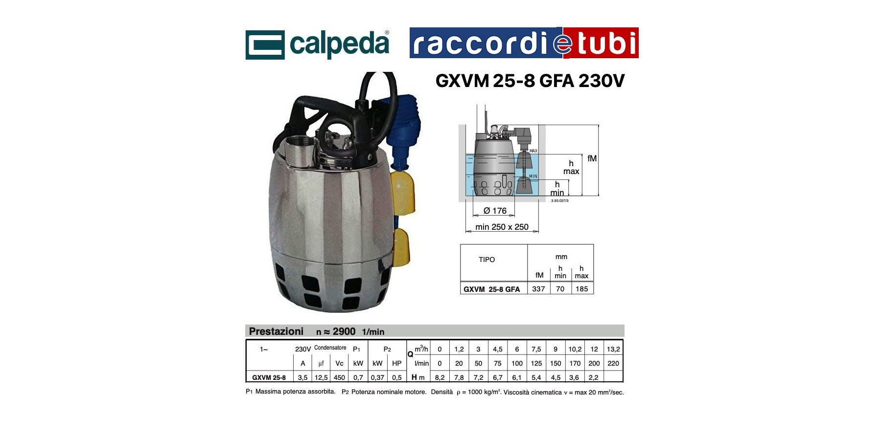 Ausführung Einflügelige Tauchpumpen aus nikromlegiertem Edelstahl mit vertikalem Auslass. GXV: mit rückversetztem Laufrad (Wirbelschaufel). Vom gepumpten Wasser gekühlter Motor mit Fluss zwischen Motorhülse und äußerer Hülse. Doppelte Wellenabdichtung mit dazwischenliegendem Ölkammer. Minima Abmessungen und hohe Leistung, geeignet für vielfältige Anwendungen, Förderhöhe bis 12,7 m und Fördermenge bis 220 Liter pro Minute. Einsatz GXR: - Sauberes Wasser mit Festkörpern bis zu 10 mm Durchmesser. - Auspumpen von überschwemmten Räumen oder Becken. - Wasserentnahme aus Teichen, Bächen, Regenwassersammelstellen und für Bewässerung. GXV: - Sauberes oder leicht verschmutztes Wasser mit Festkörpern bis 25 mm Durchmesser. - Besonders geeignet für Flüssigkeiten mit hohem Feststoffanteil. Für den Außeneinsatz muss das Stromkabel mindestens 10 m lang sein. Ausführung nach: EN 60 335-2-41. Einsatzgrenzen Flüssigkeitstemperatur bis 50 °C. Maximale Eintauchtiefe: 5 m. Minimale Entleerungshöhe mit Schwimmer 70 mm für GXR und 130 mm für GXV. Minimale manuelle Entleerungshöhe 15 mm für GXR und 30 mm für GXV. Dauerbetrieb. Motor Induktionsmotor 2-polig, 50 Hz (n = 2900 1/min). GXR, GXV: Drehstrom 230 V ± 10%; Drehstrom 400 V ± 10%. GXRM, GXVM: Einphasen 230 V ± 10%, mit Schwimmerschalter und Thermoschutz. Kondensator eingebaut. Isolierung Klasse F. Schutzart IP X8 (für Dauerbetrieb unter Wasser). Trockenwicklungen mit doppellagiger Feuchtigkeitsbeständiger Imprägnierung. Ausführung nach: EN 60335-2-41.