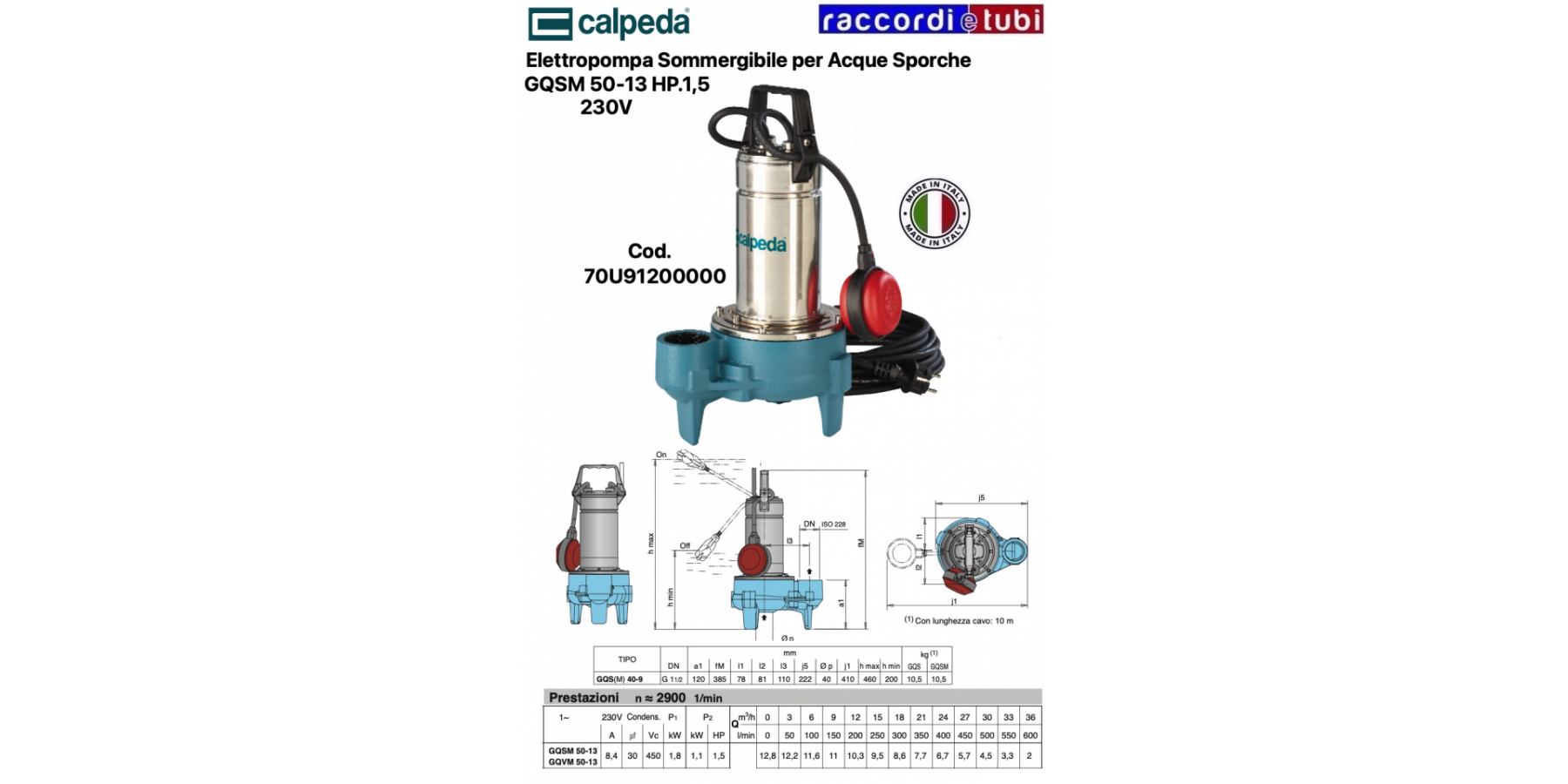 Ausführung einläufiger Tauchpumpen mit Rückwärtslaufrad (Vortex) und vertikal gewindetem Förderstutzen. Doppelwellendichtung mit dazwischenliegender Ölkammer, geschützt gegen Trockenlauf. Einsatzgebiete Für nicht aggressive Abwässer aus Haushalt und Industrie bezüglich der Pumpenmaterialien, für verschmutztes Wasser auch mit Festkörpern bis Ø 40 mm. Entwässerung von überfluteten Räumen oder Becken. Wasserentnahme aus Teichen, Gewässern, Regenwassersammelgruben und zur Bewässerung. Einsatzgrenzen Flüssigkeitstemperatur bis 35 °C. pH-Wert: 6-11. Maximale Eintauchtiefe: 5 m. Minimale Eintauchtiefe: 200 mm. Dauerbetrieb (mit Tauchmotor). Motor 2-poliger Induktionsmotor, 50 Hz (n = 2900 1/min). GQS: Drehstrom 230 V ± 10%; Drehstrom 400 V ± 10%. Kabel H07RN-F, 4G1 mm², Länge 10 m, ohne Stecker. GQSM: Einphasen 230 V ± 10%, mit Schwimmerschalter und Thermoschutz. Integrierter Kondensator. Kabel H07RN-F, 3G1 mm², Länge 10 m, mit CEI-UNEL 47166 Stecker. Isolationsklasse F. Schutzart IP X8 (für Dauerbetrieb unter Wasser). Trockenwicklung mit zweifacher Imprägnierung, feuchtigkeitsbeständig. Ausführung gemäß: EN 60034-1; EN 60335-1, EN 60335-2-41.