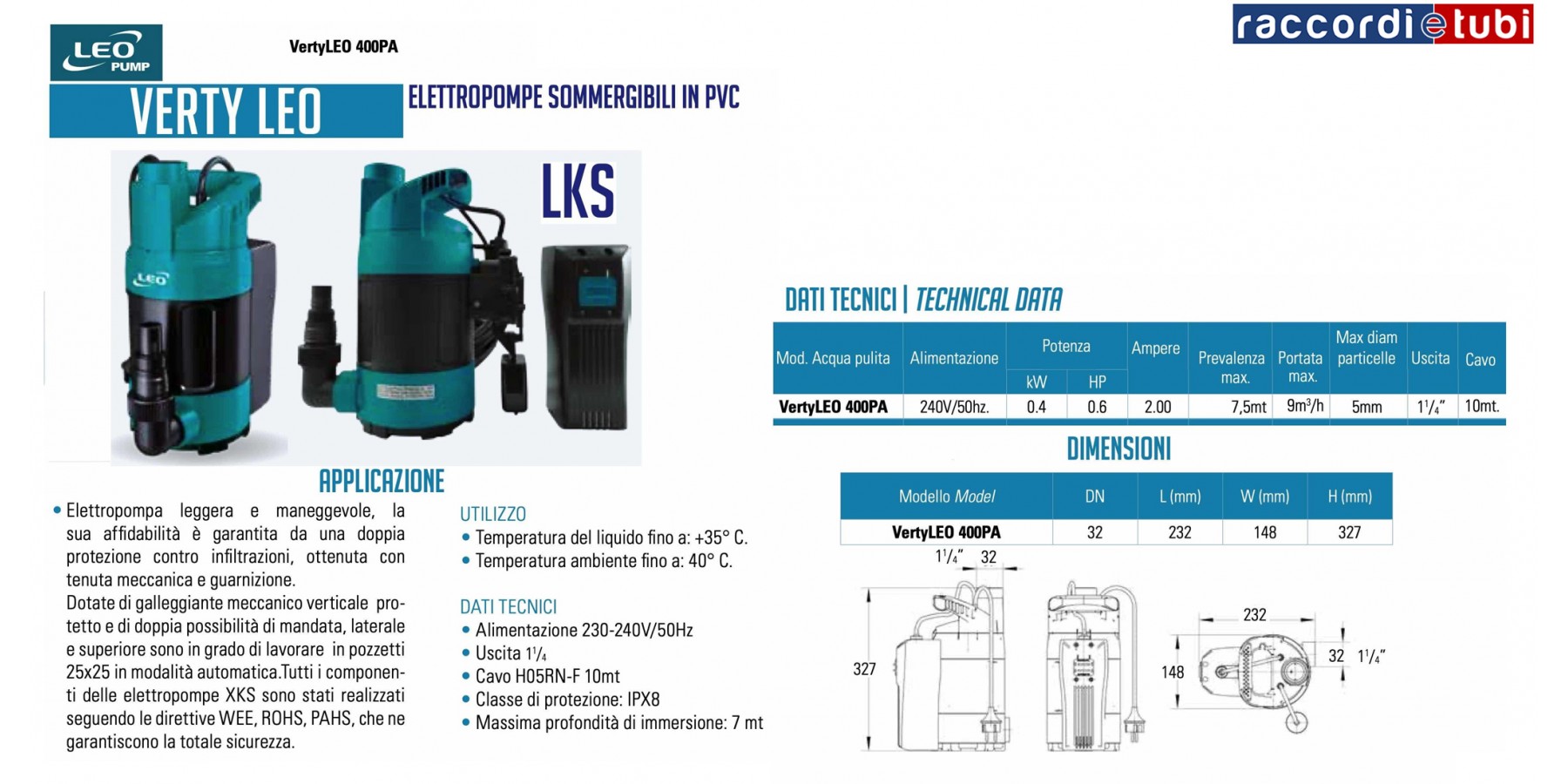 Tauchpumpe | LEO Pump | Klarwasser | Einphasenmotor | LKS-400PA | H. 7,5m | Lt.150 | PS 0,6