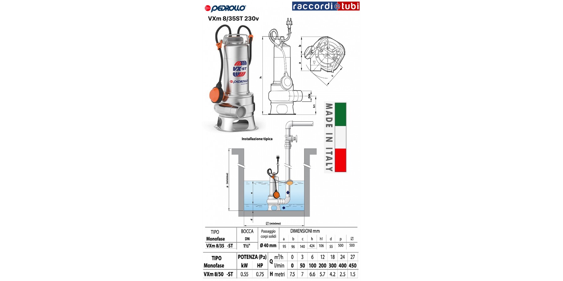 ※ Das Laufrad VORTEX ermöglicht das Pumpen von Festkörpern mit einem Durchmesser von bis zu 50 mm und garantiert dank seiner besonderen Geometrie einen sicheren Betrieb ohne Verstopfungsgefahr.